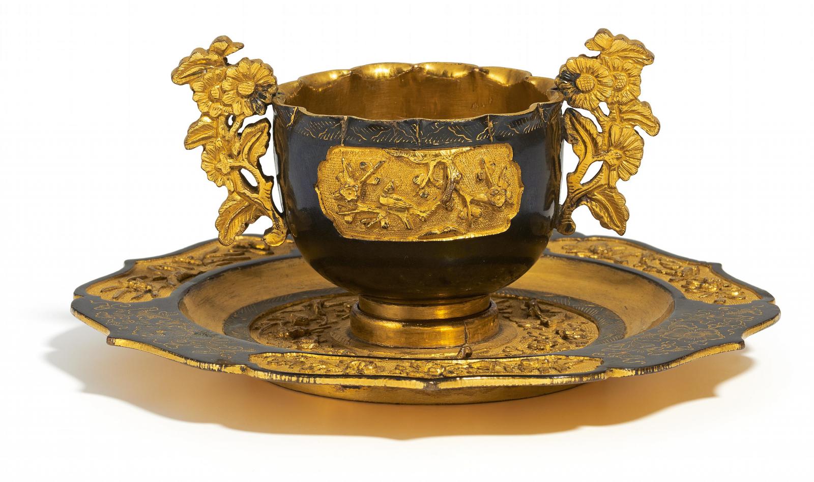 Beschreibung: Kleine Tasse mit zwölffach blütenförmig eingezogenem Rand, innen vergoldet. Außen zwei Kartuschen mit geschwungenem seitlichem Abschluss, darin in Relief Blütenzweige. Die beiden Henkel in Form blühender Chrysanthemenzweige. Der Unterteller blütenförmig sechsfach gelappt, mit drei Kartuschen mit Blütenzweigen und Vögeln, dazwischen symmetrische Blütenranken in die lackierten Bereiche graviert und vergoldet. Im Zentrum ein Ring zum Abstellen der Tasse mit einer gravierten Chrysanthemenblüte, darum ein Ring mit blühenden Bäumen mit Vögeln in Relief, abgeschlossen mit einer Blätterbordüre, wie auch am Lippenrand der Tasse. Unterteller auf weitem Standring.