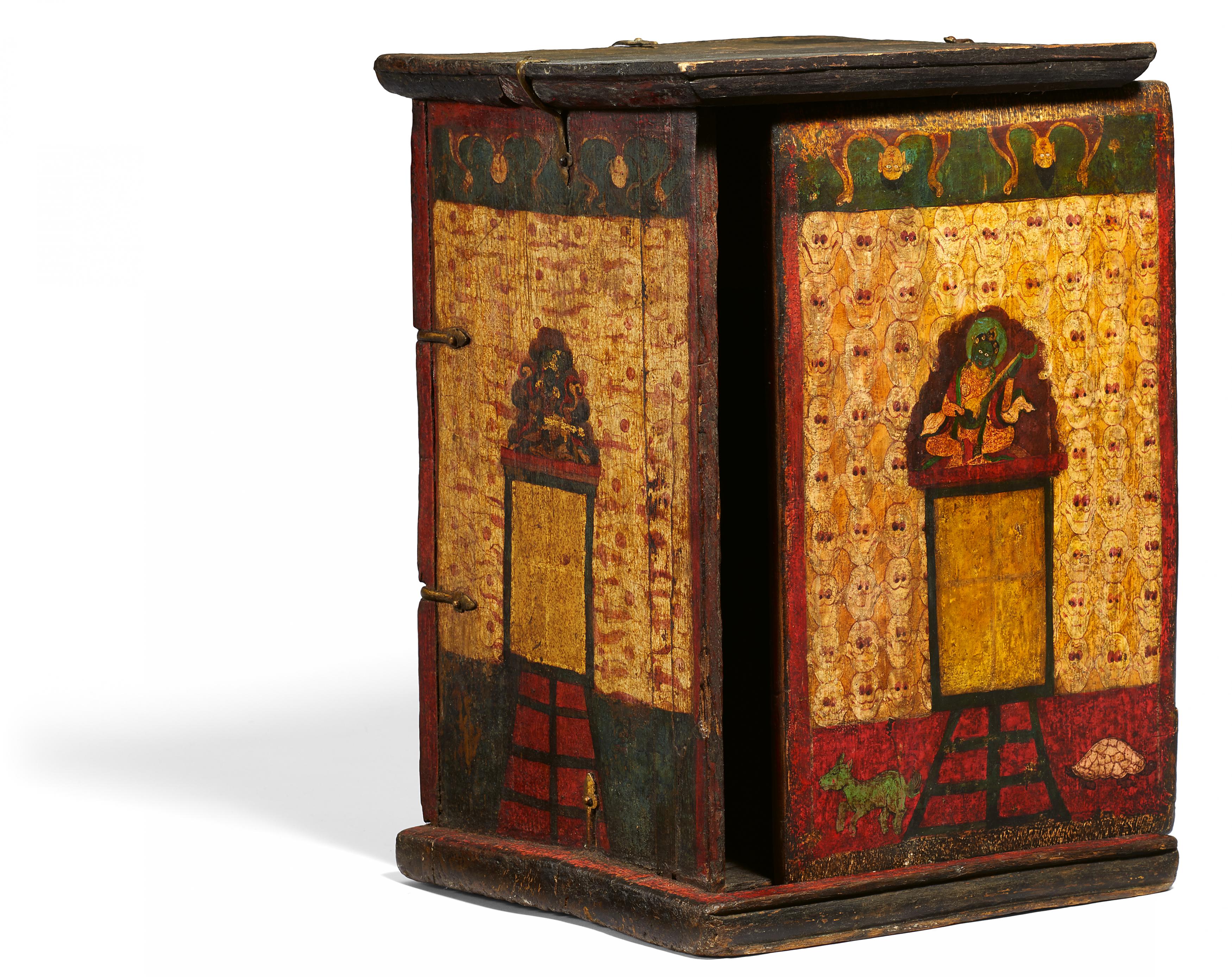 In diesen Schreinen wurden die kegelförmigen Opfergaben (Torma) aus Gerstenmehl und Wasser nach den Zeremonien für Buddha und die Lokapala aufbewahrt. Sie sind äußerst selten in westlichen Sammlungen zu finden.