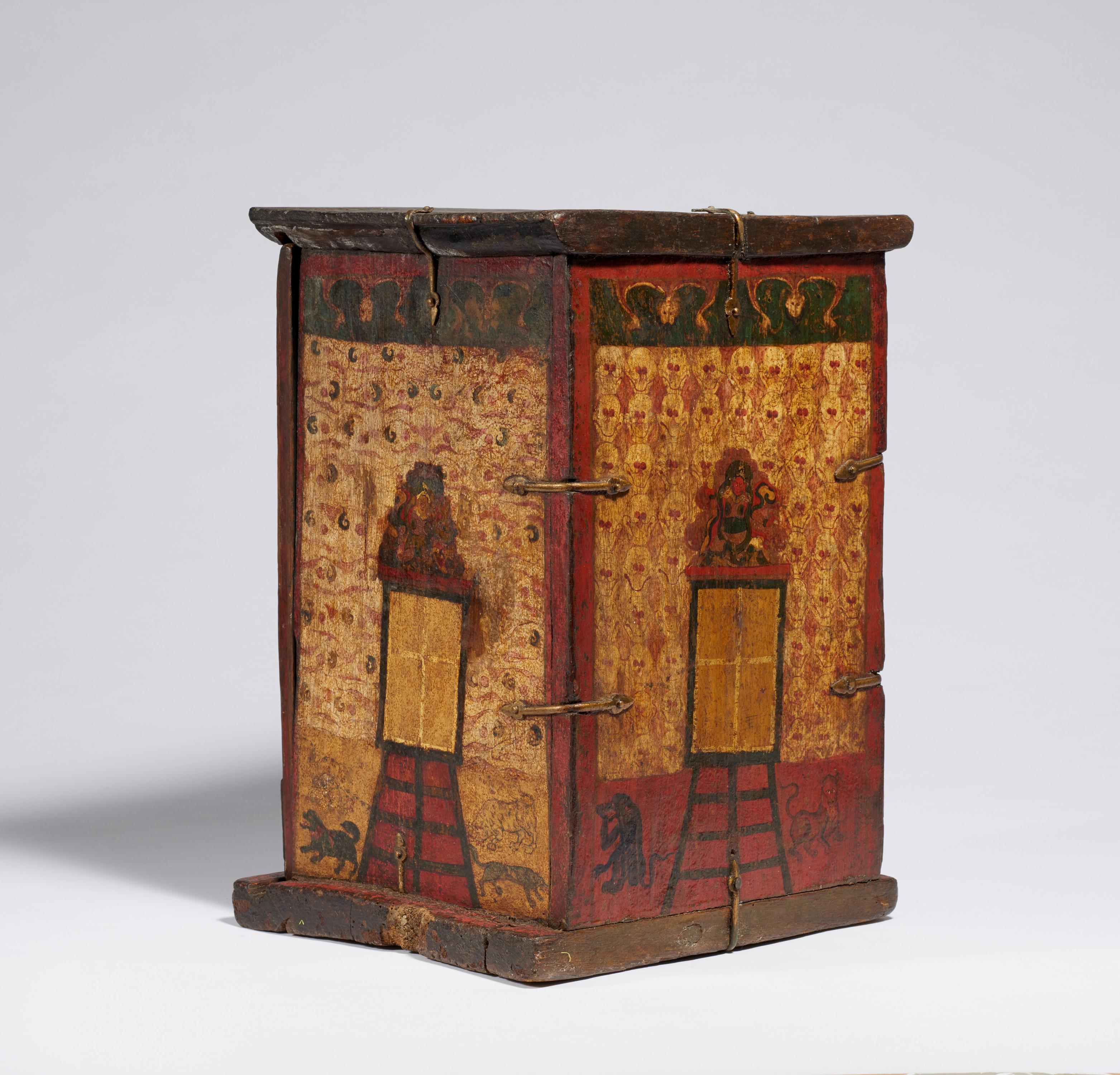 Technik: Holz, bemalt mit Pigmenten und Blattgold, Beschläge aus Bronze. An der Vorderseite eine Schiebetür.