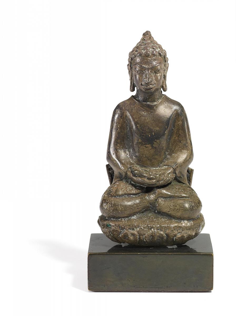 Beschreibung: Sitzend in padmasana auf einem Lotossockel, die Hände in dhyana mudra. Das Gewand umschließt den gesamten Körper und wird am Hals wie auch an den Händen deutlich. Es scheint jedoch aus einem Material, das sich fließend den Formen anschmiegt, so dass der geschlechtslose Körper durchscheint. Im Antlitz fallen die typischen, etwas hervorquellenden Augen auf und die eleganten, von der Nasenwurzel ausgehenden Augenbrauen, 'geformt wie eine fliegende Schwalbe'.