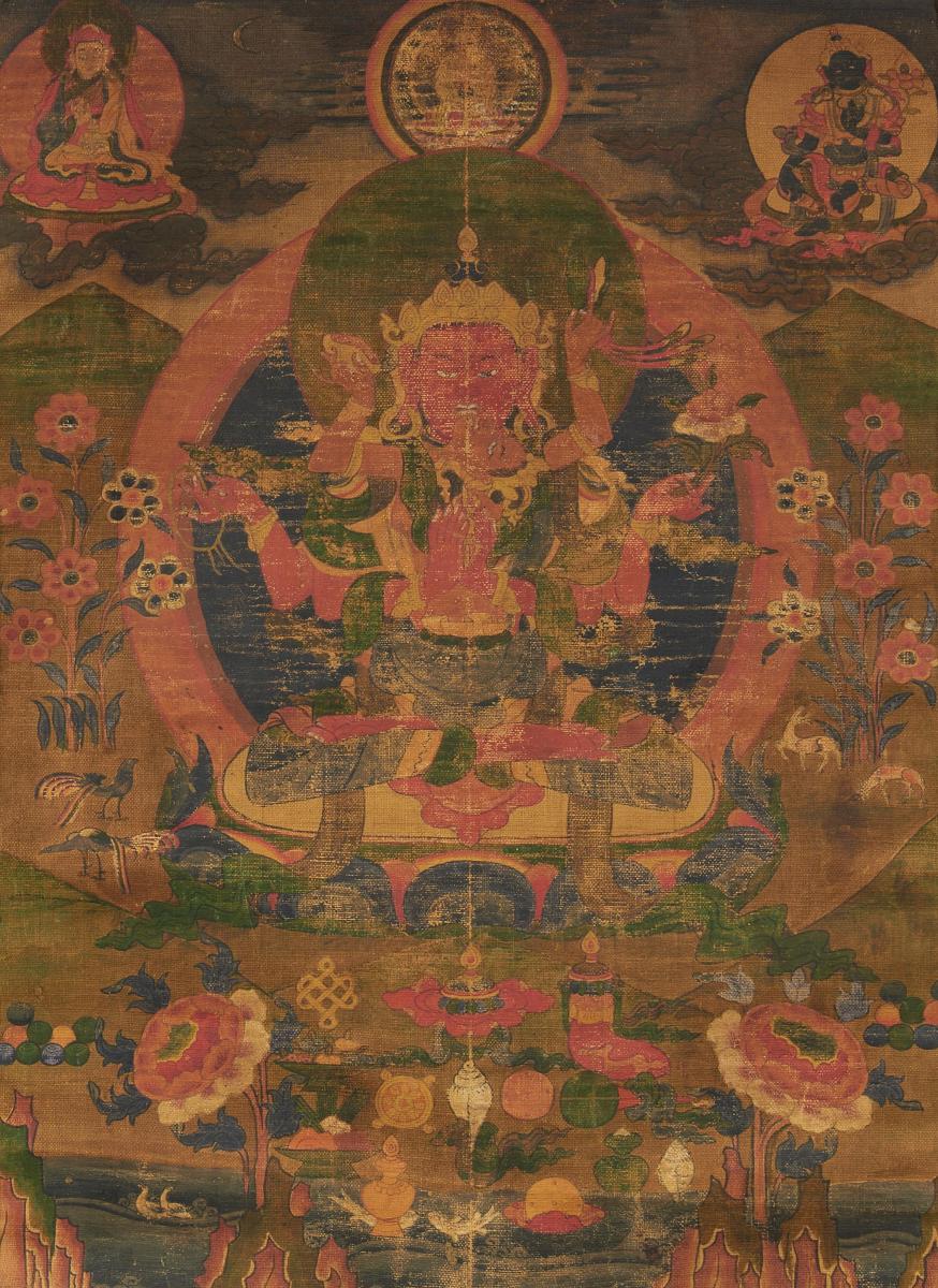 Beschreibung: Im Zentrum der rothäutige, vierarmige Jinasagara, eine Form des Avalokitishvara, in yabyum auf einem Lotosthron vor einer Mandorla. Er entstammt den Lehren des Padmasambhava, der hier oben links dargestellt ist. Rechts ist Ekajati, die blaue Tara gezeigt. Die mittlere Figur ist zu berieben, um sie sicher zu bestimmen, evtl. Avalokiteshvara oder Vairocana. Vor der Hauptfigur ausgebreitet Opfergaben und einige der Ashtamangala. In der umgebenden Landschaft mit großen Blüten tummeln sich Vögel, Wildtiere und in einem Gewässer auch Fische.