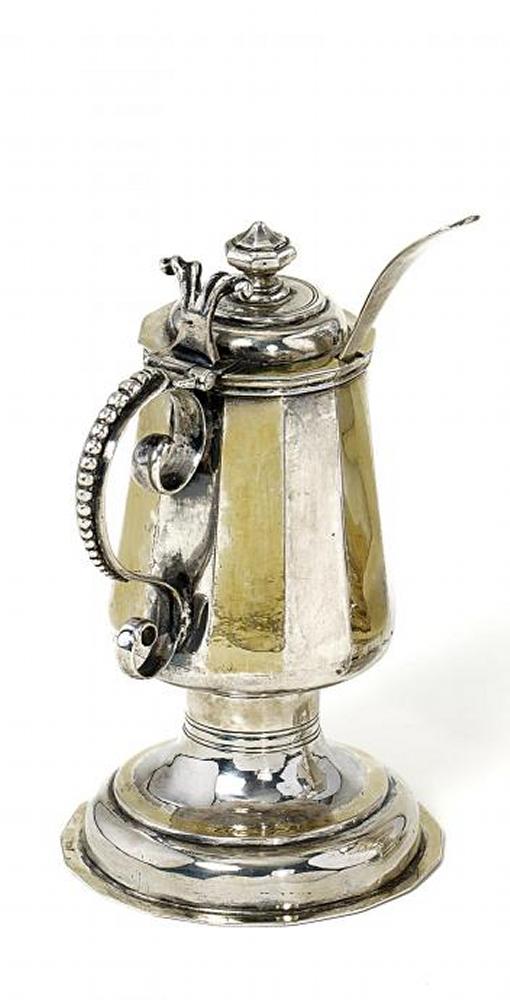 Silber mit Teil- und Innenvergoldung. Auf rundem, zweifach eingezogenem Fuß, facettierter Korpus. Zierlicher Volutenhenkel mit