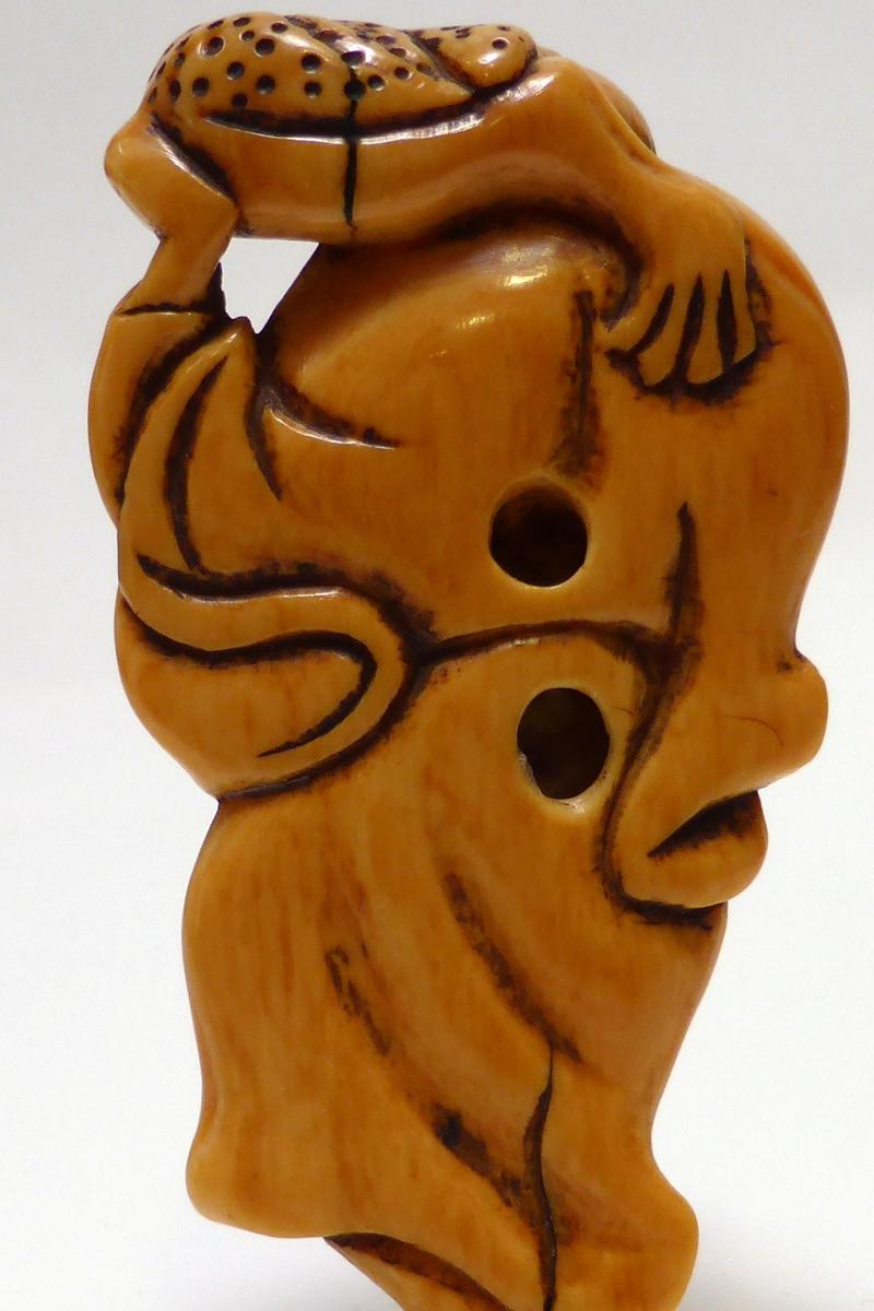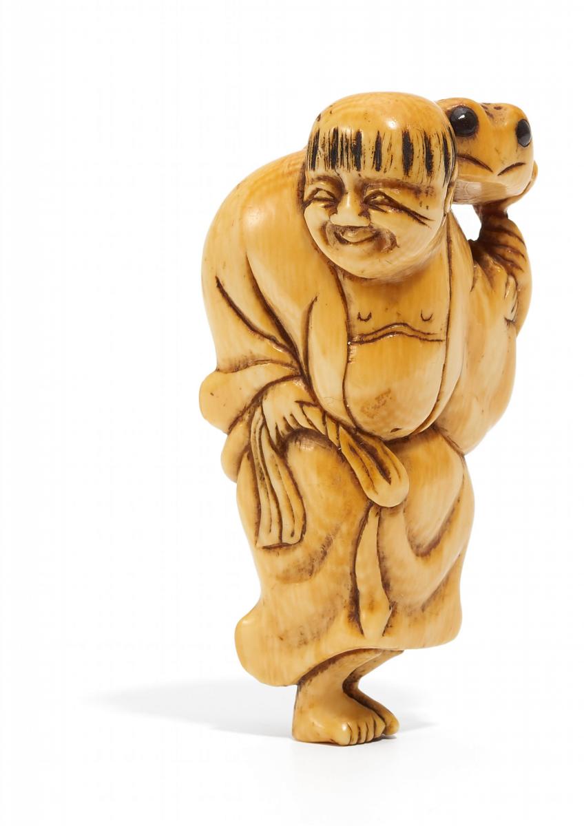 Technik: Elfenbein, fein graviert, teils eingefärbt, die großen Augen des Tieres eingesetzt aus schwarzem Horn. Wunderschöne, bernsteinfarbene Patina.