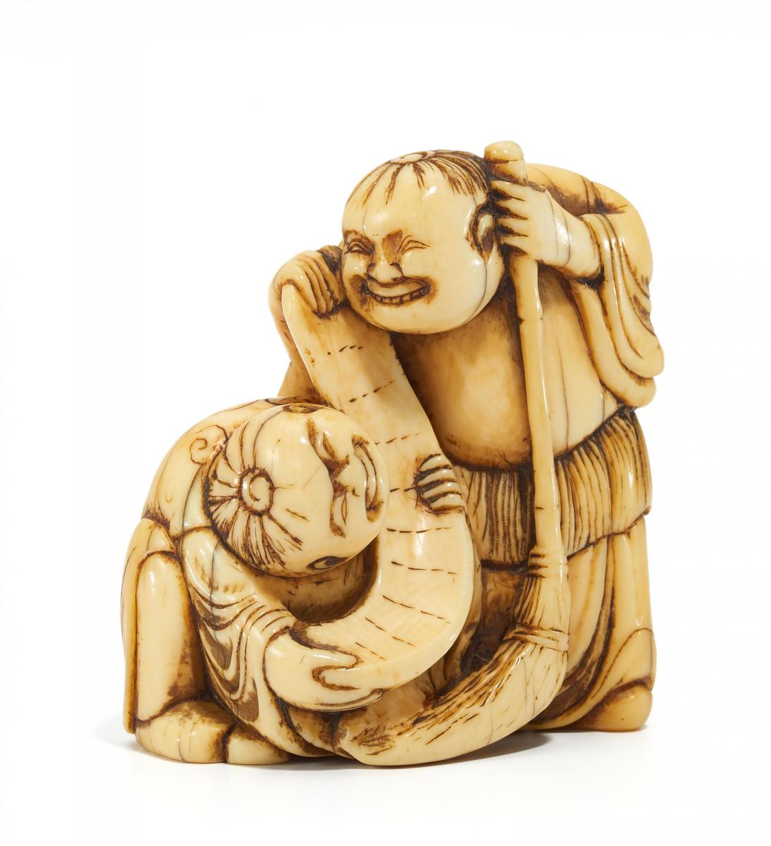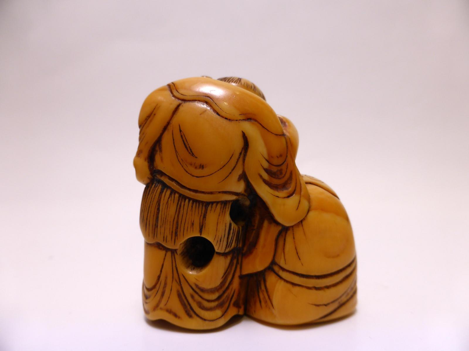 Technik: Elfenbein mit fein gravierten Details. Auf dem Rücken wunderschöne, bernsteinfarbene Patina.