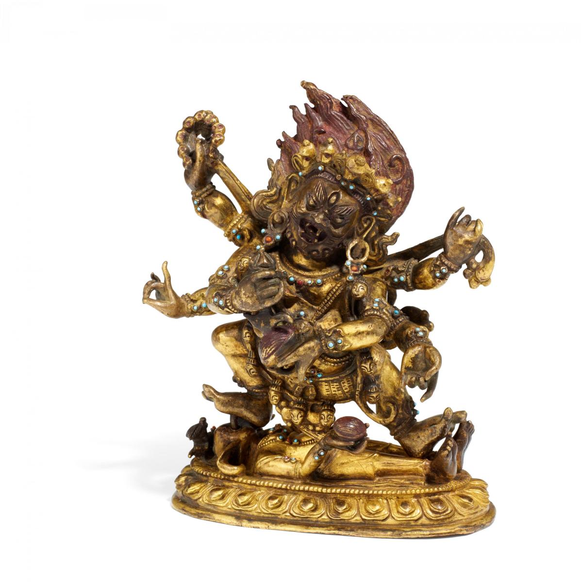 Beschreibung: Der sechsarmige Mahakala auf Ganapati stehend und Hackmesser und Schädelschale vor der