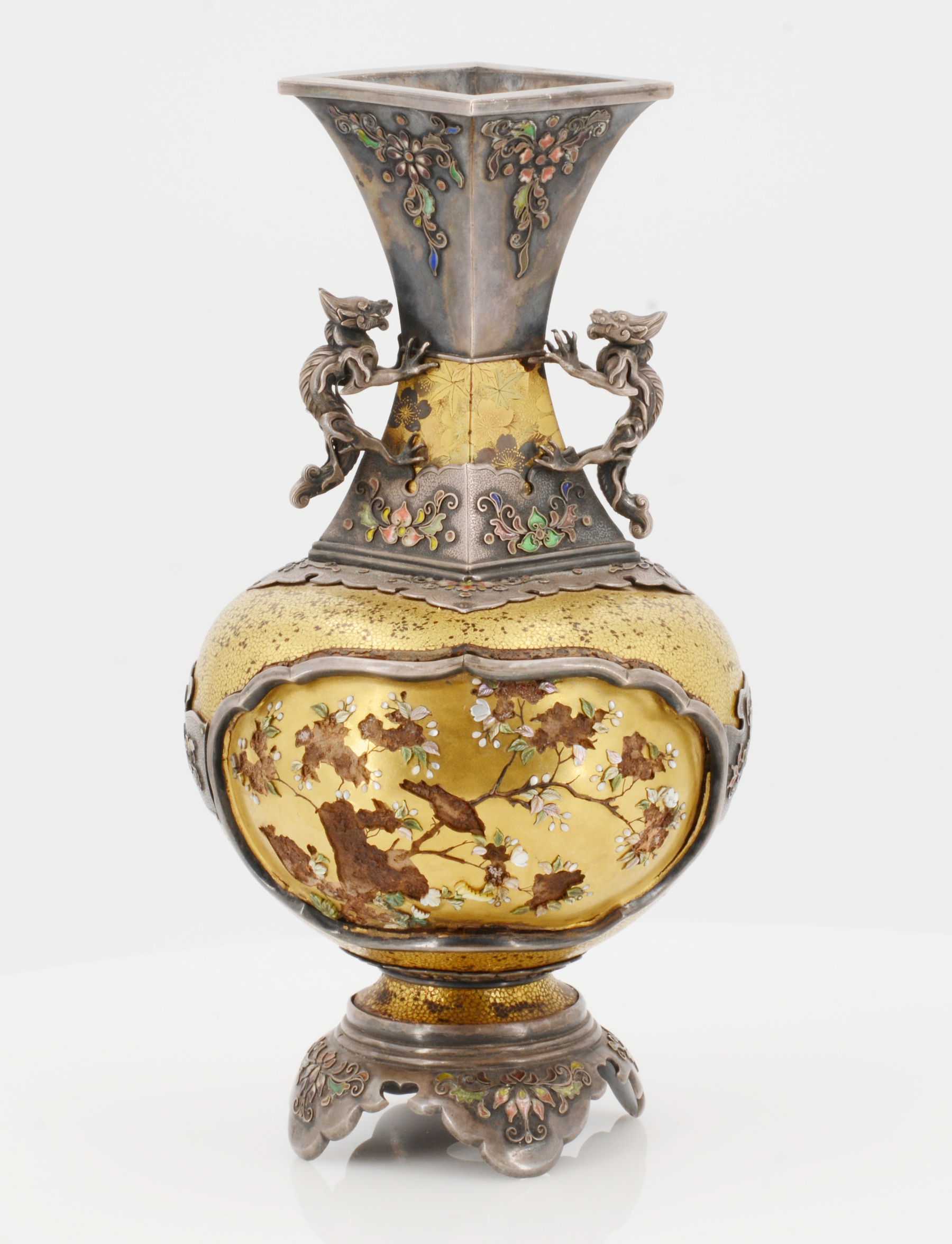 Technik: Holz mit Goldlack, Shibayama-Einlagen (größtenteils ausgefallen), Silbermontierung (teils verbogen) mit Email.