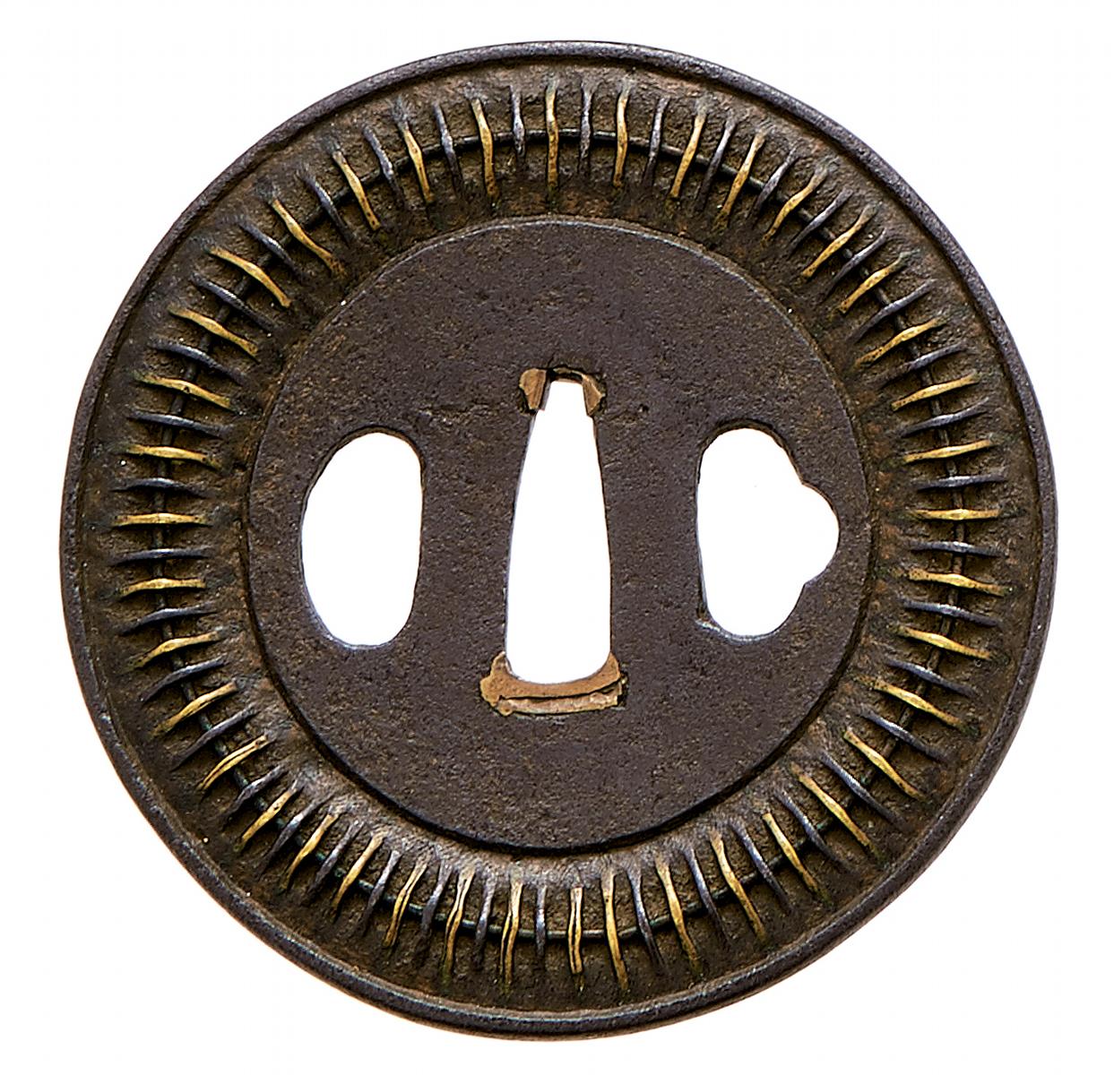 Beschreibung: Die kräftige Eisenplatte mit einem abgesetzten, schmalen Rand zeigt an diesem entlang das