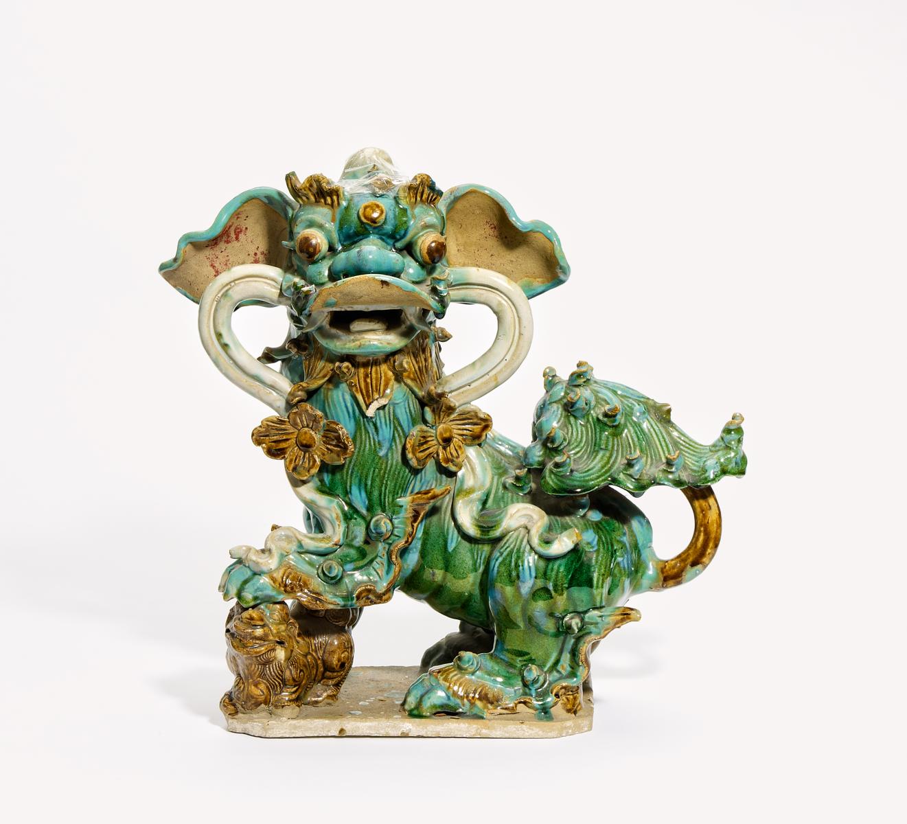 Technik: Shiwan Keramik mit grüner, türkisblauer, weißer und brauner Glasur.