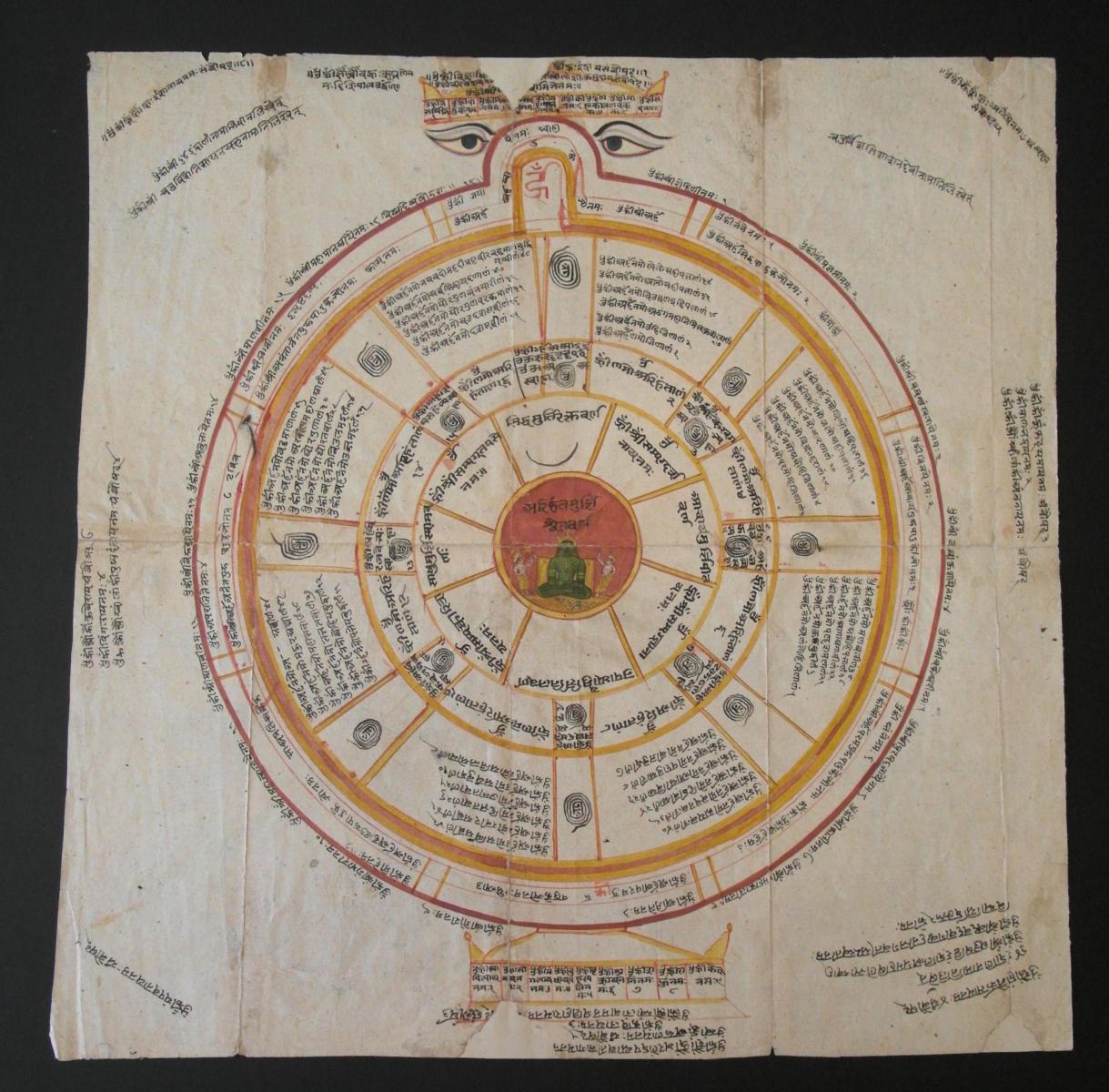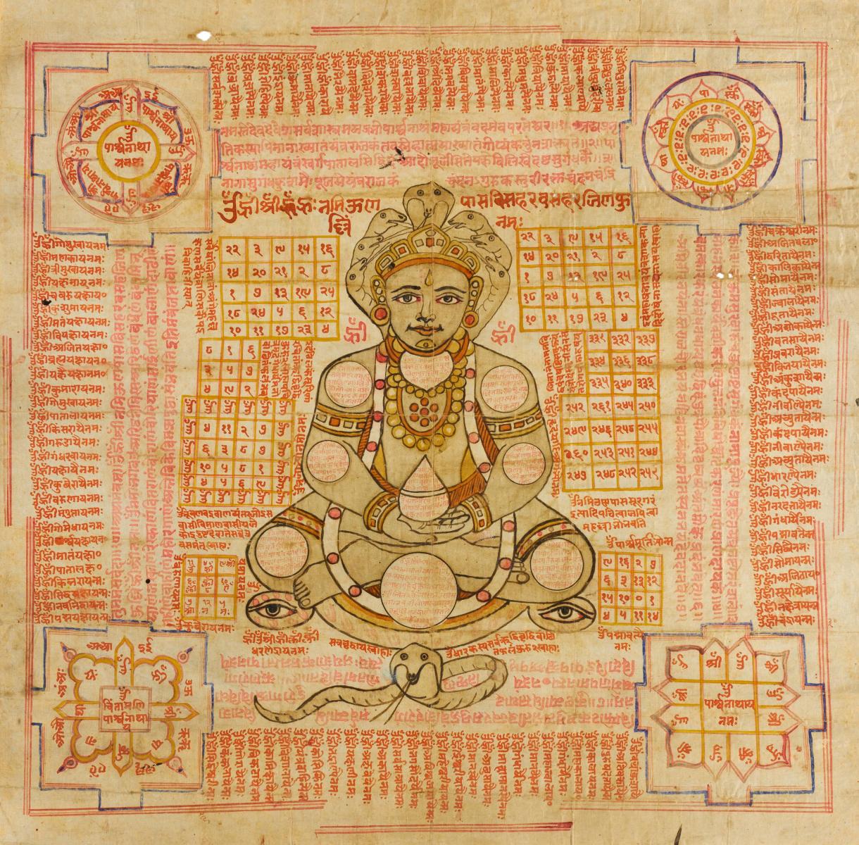 Beschreibung: a) Yantra mit sitzendem Jain, gekrönt von sieben Schlangen. Auf Gewebe. 47x48cm. b) Siddha