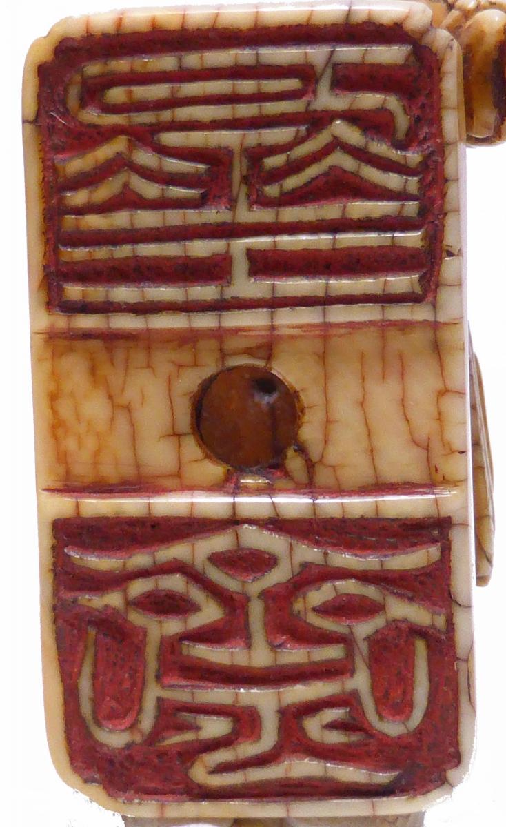 Beschreibung: In Siegelschrift zwei Schriftzeichen in zwei rot eingefärbten Reserven auf dem Sockel. Das