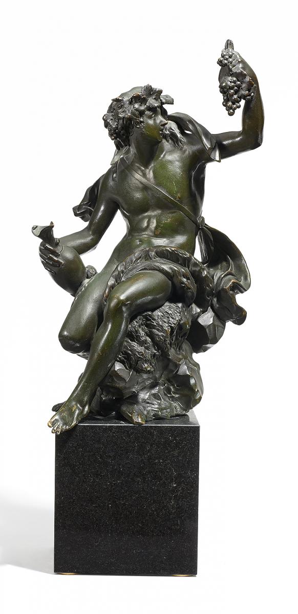 Bronze patiniert. Schwarzer Marmorsockel. Sitzender Bacchus mit Weinkanne und Trauben. Höhe insgesamt 56 cm. Zustand A/B.