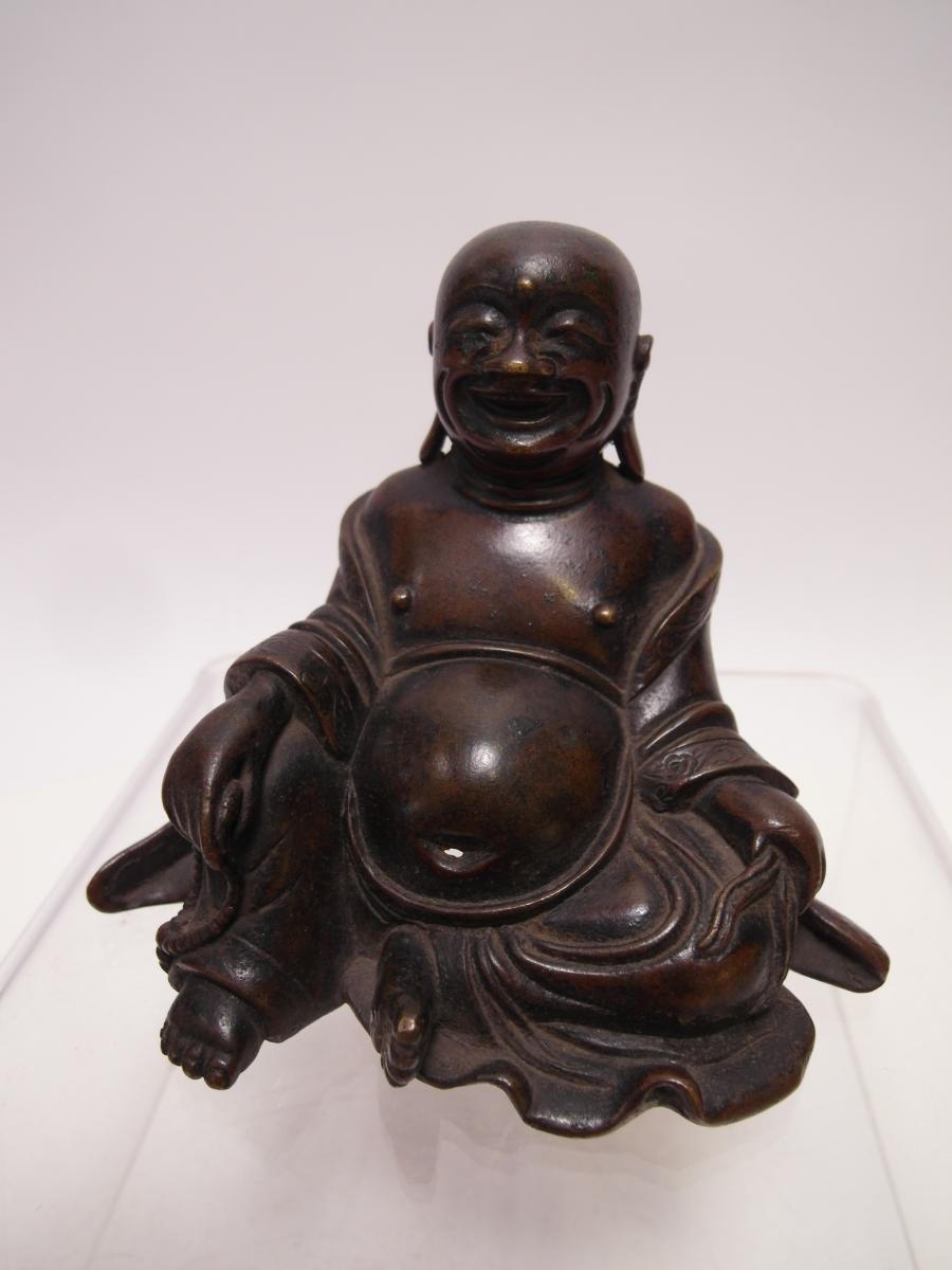 Zustand A/B. Beilage: Kleiner sitzender Budai mit Gebetskette. Bronze mit dunkler Patina. China. 18./19. Jh. H.8,5cm. Zustand A/B.