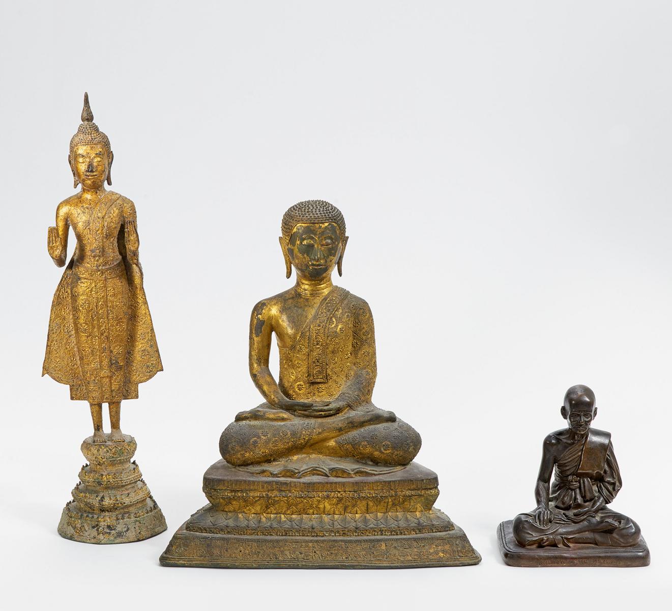Zustand A/B. Beilage: Portrait eines sitzenden Mönchs mit Stiftungsinschrift. Bronze mit bräunlicher Patina. Thailand. 20. Jh. H. 19cm.