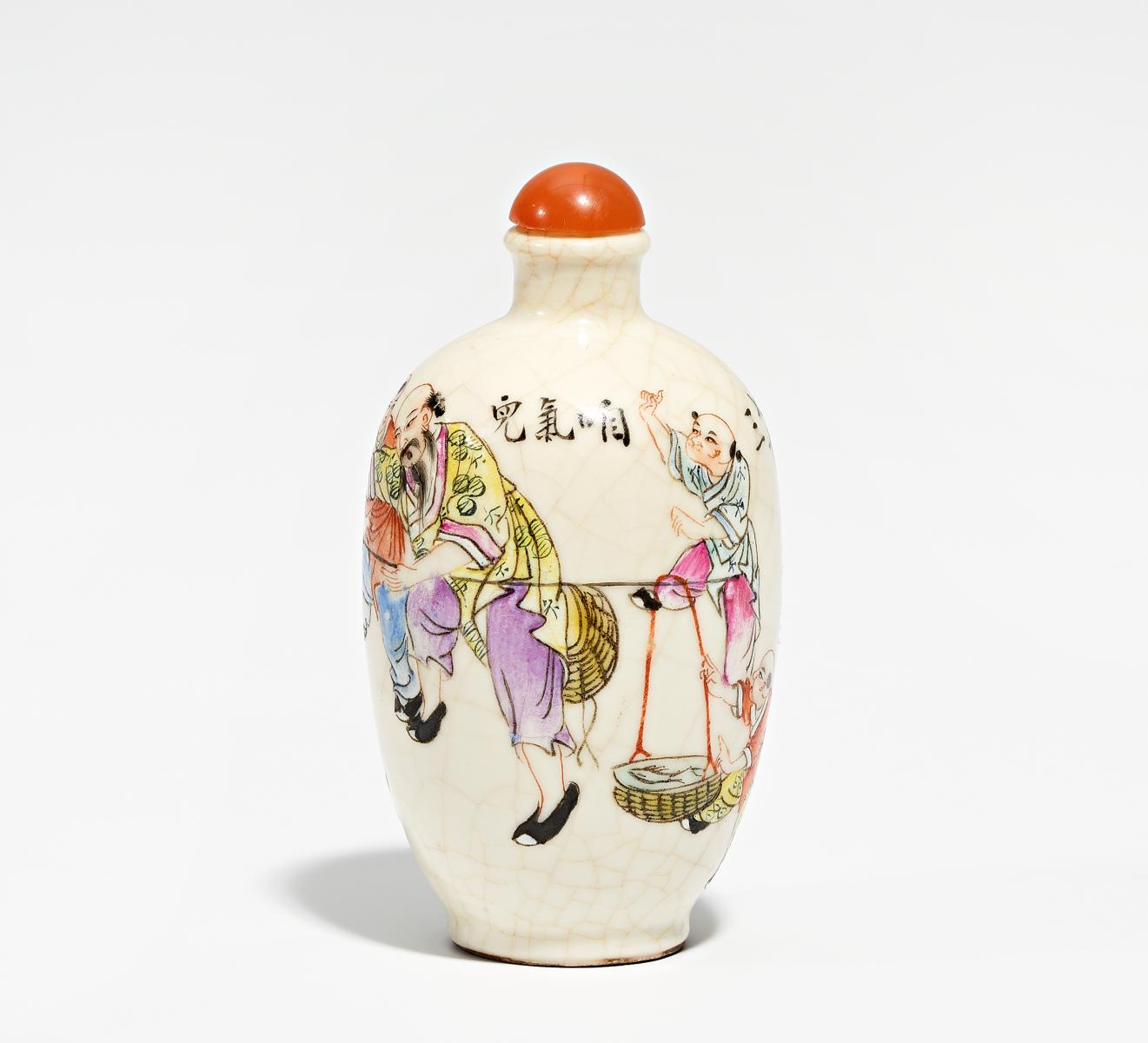 Technik: Porzellan, krakelierte Glasur mit Aufglasurfarben bemalt.