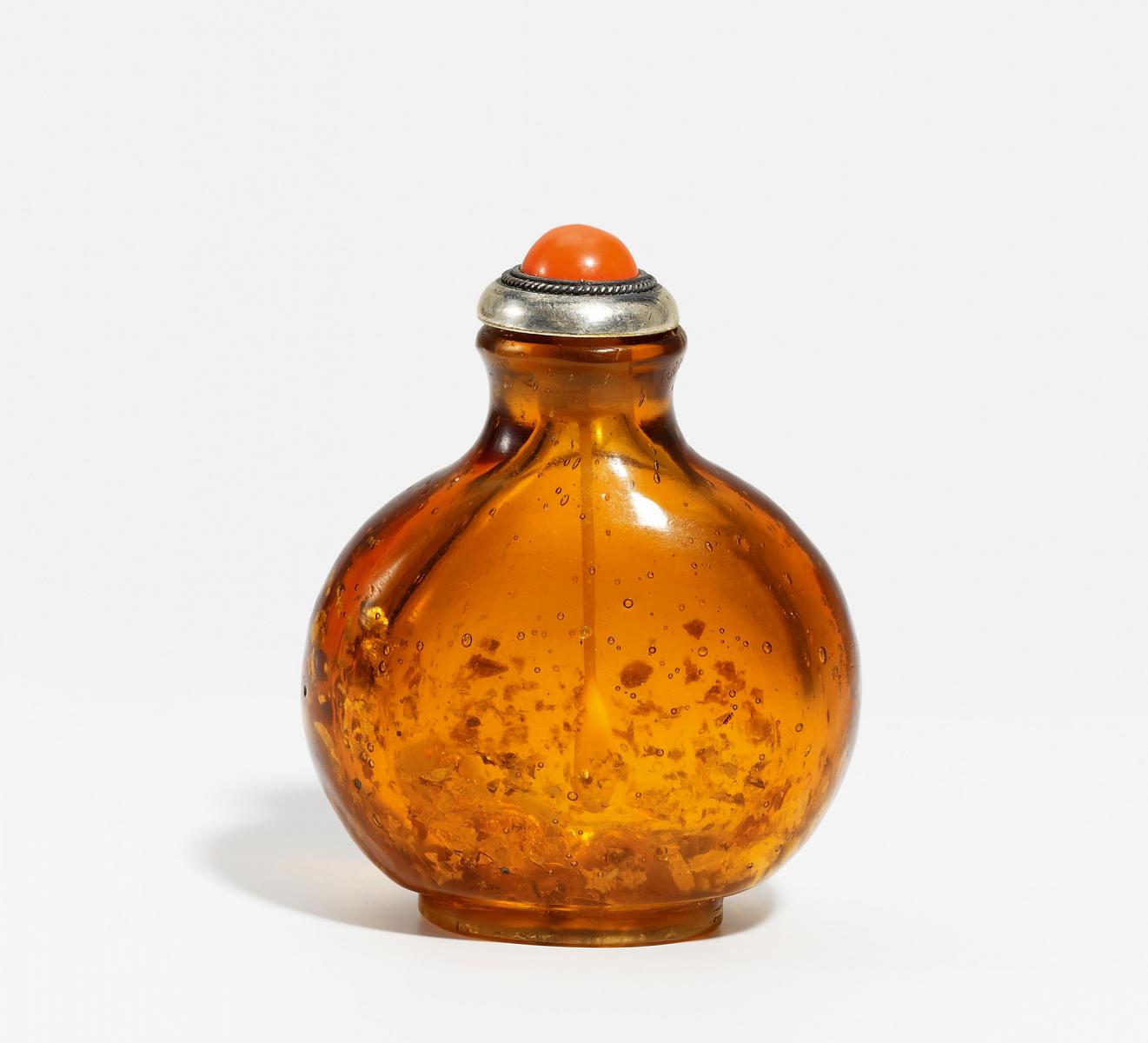 Technik: Transluzentes Glas mit Blattgold-Einschlüssen, in der Art von Aventurin. Silber-Stöpsel mit korallenfarbigem Glas.