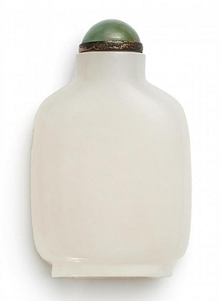 Technik: Weiße Jade mit einer Seite hellbrauner Außenhaut. Gut ausgebohrt. Stöpsel grüne Jade in Metallfassung.