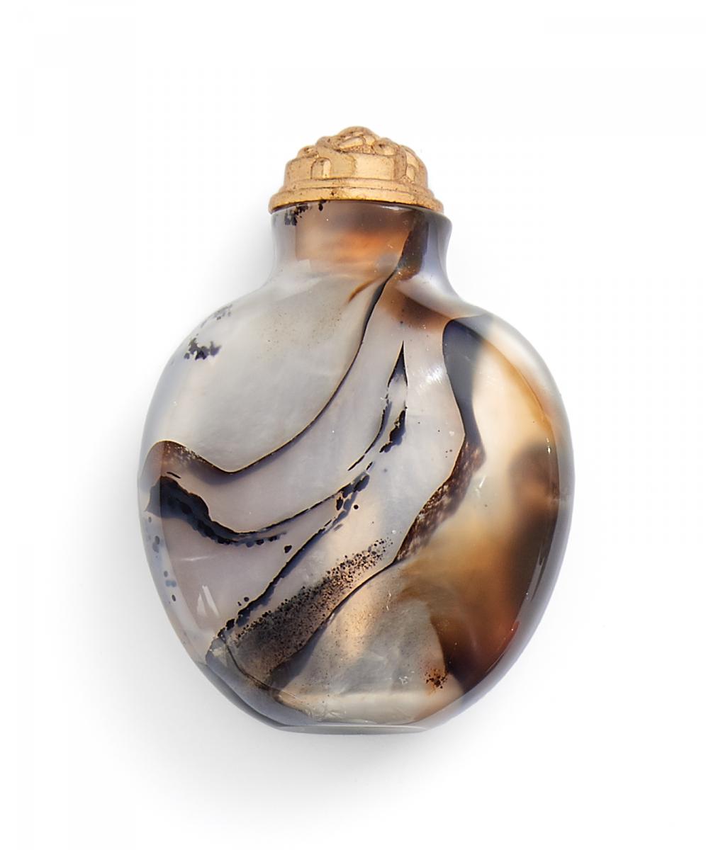 SNUFFBOTTLE. BREIT OVAL, MAUSGRAU MIT SCHWARZEN EINSCHLÜSSEN UND BRÄUNLICHER BÄNDERUNG. ACHAT.
