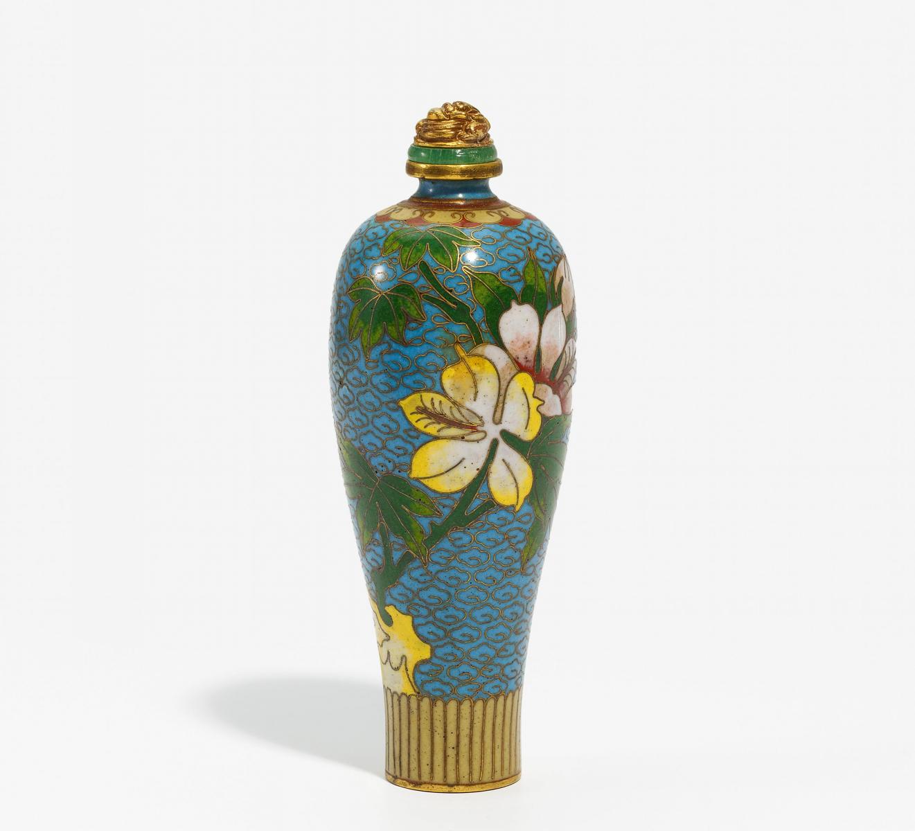 Technik: Cloisonné auf Kupfer, Stege vergoldet. Auf türkisfarbenem Wolken-Fond Magnolien-Zweige. Stöpsel vergoldete Bronze.