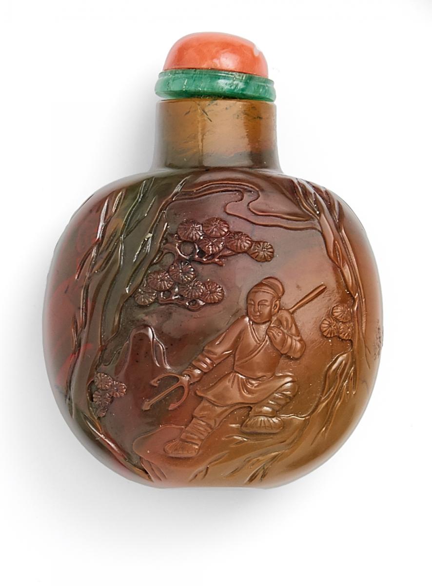 SNUFFBOTTLE. SELTENER JASPIS IN GRÜN- UND ROTBRAUN-TÖNEN. BREIT RECHTECKIG GERUNDET.