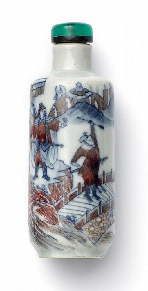 SNUFFBOTTLE. SZENE AUF EINER BRÜCKE. PORZELLAN.