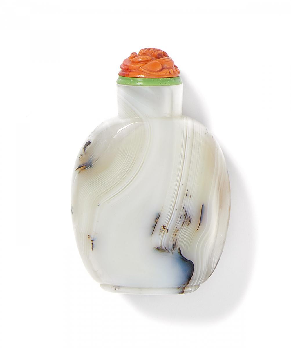 Technik: Fein gestreifter Achat mit weißlichem Grund und dunklen Einschlüssen. Stöpsel Koralle mit Drache.