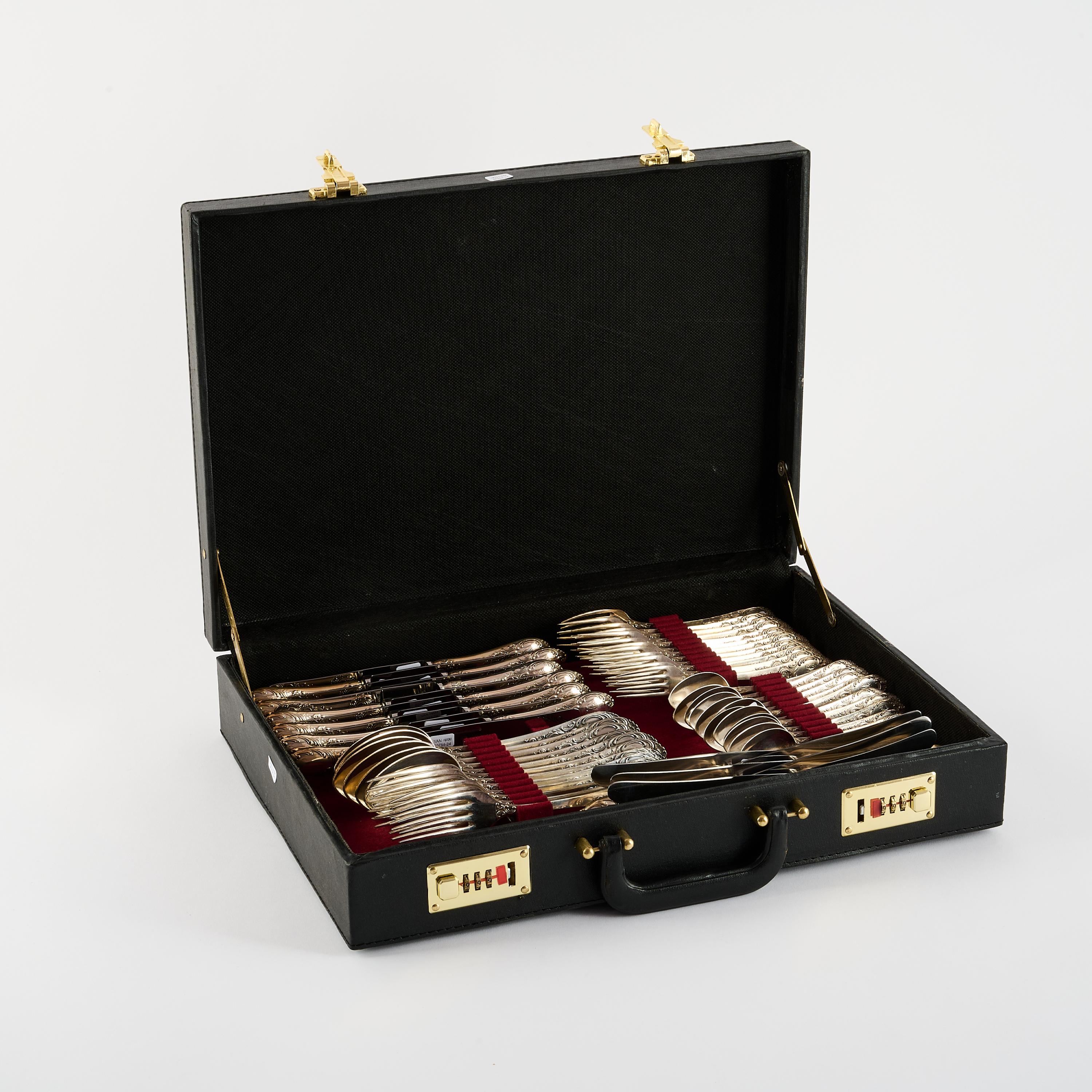 Auf den Griffen jeweils graviertes Besitzermonogramm "IH". Bestehend aus 12 Vorspeisenmessern, 12 Vorspeisengabeln, 6 Menuemessern, 6 Menuegabeln, 6 Menuelöffeln, 12 Kaffeelöffeln. .