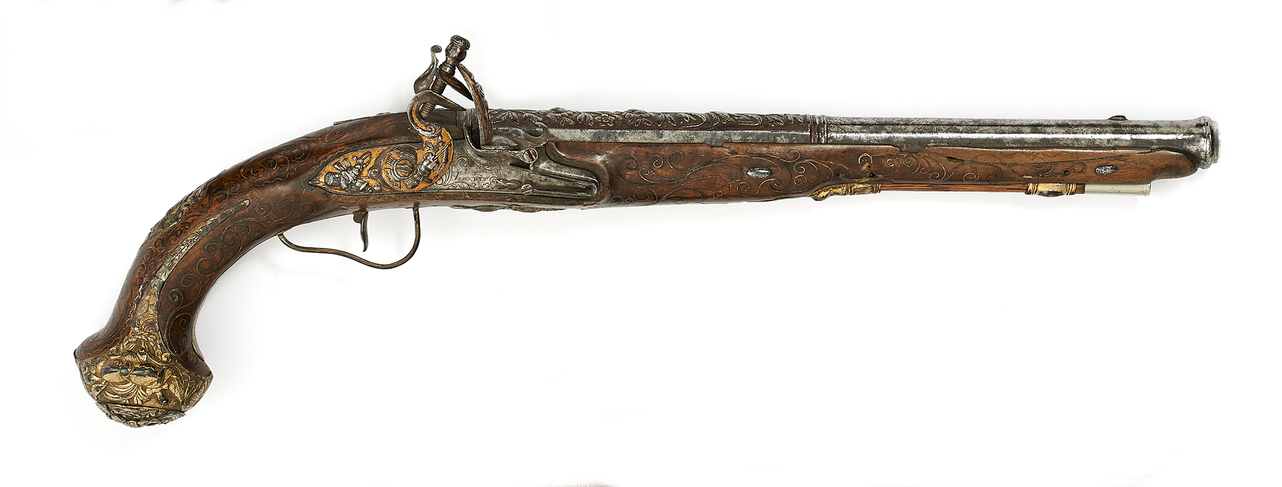 Eisen, Messing, Nussbaum geschnitzt. Auf Schloss und Garnitur reliefierte Kriegstrophäen. Länge 50 cm.
