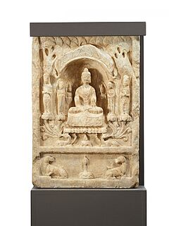 Buddha mit hoher Ushnisha in Lotoshaltung auf einem Thron und sein Gewand fällt in reiche
