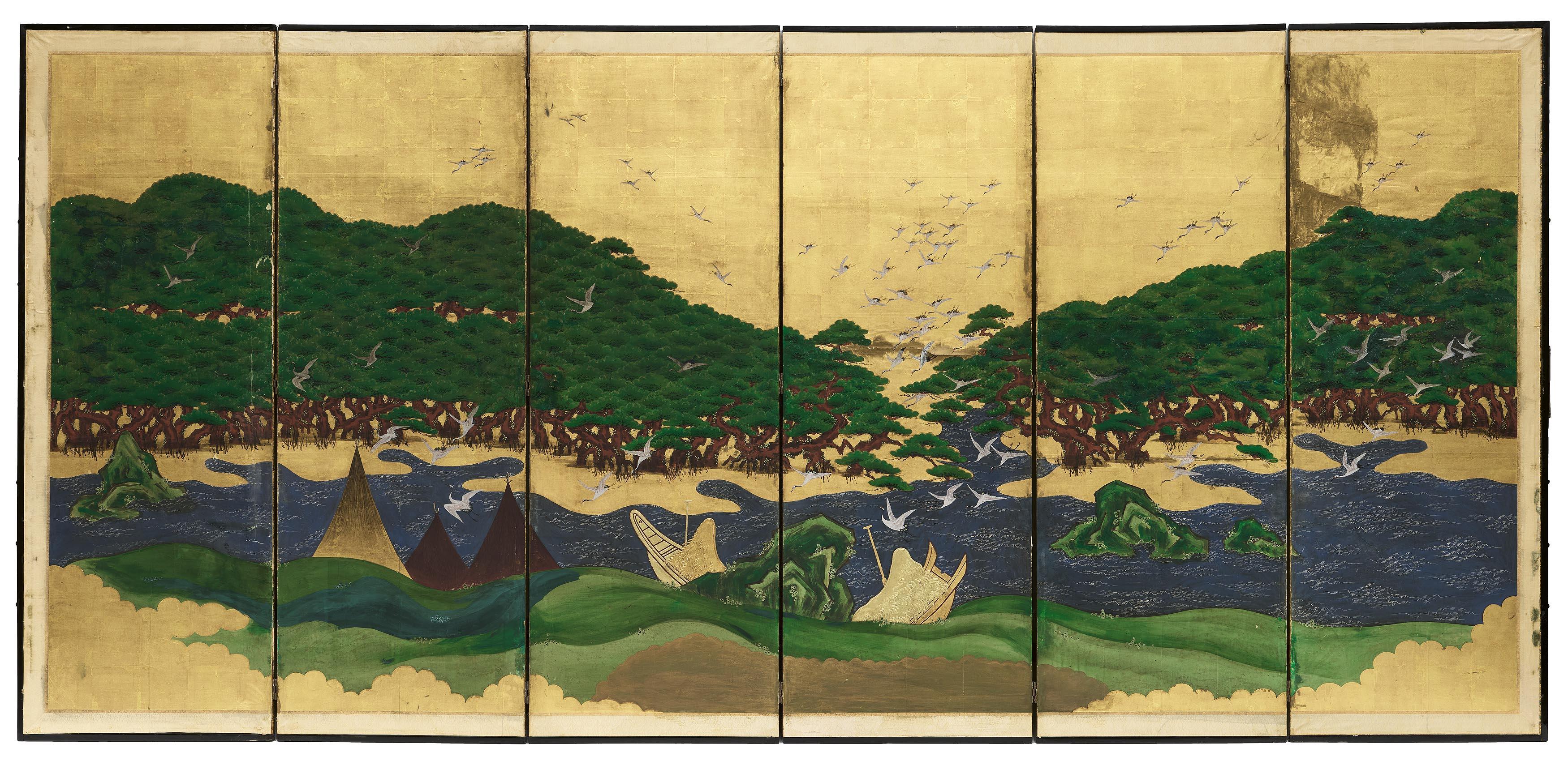 Beschreibung: 6tlg. Kiefernhain an einer Küste mit Lastkahn und Vogelschwärmen mit Kranichen.