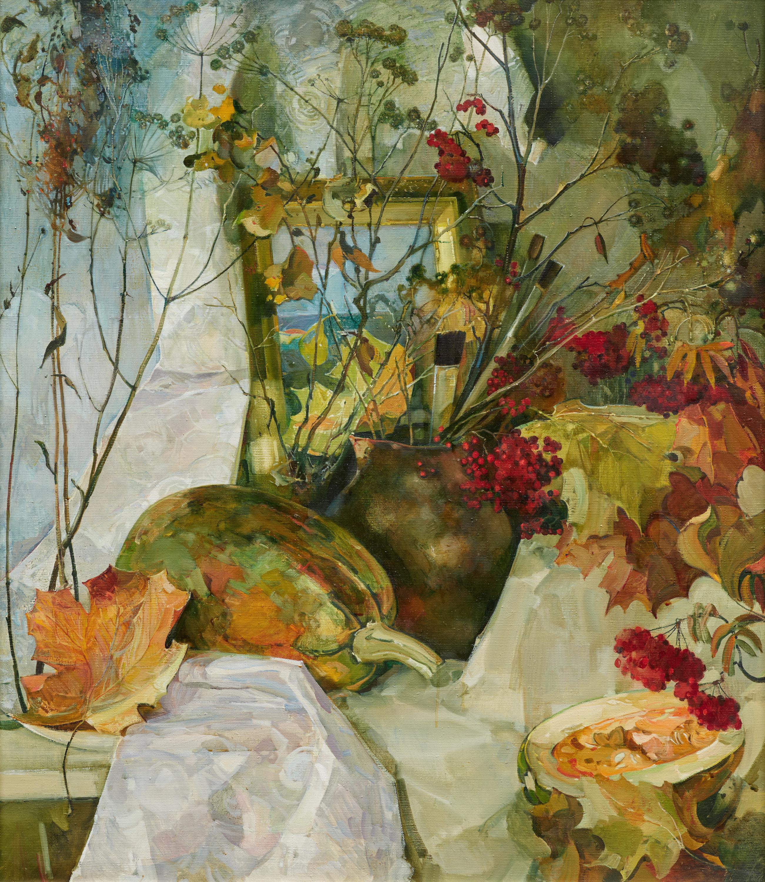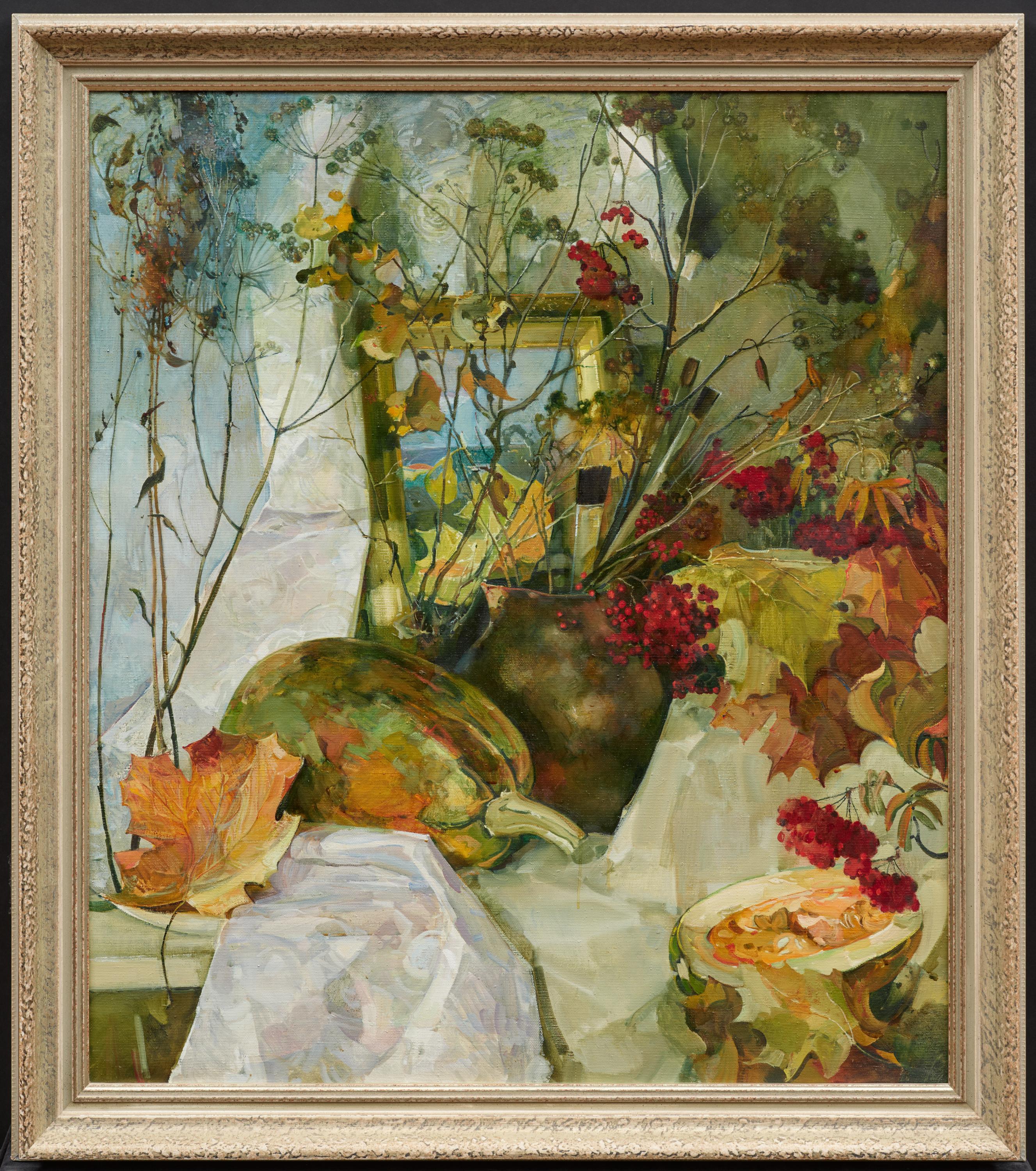 STILLLEBEN MIT BLUMEN, KÜRBISSEN UND EINEM GEMÄLDE