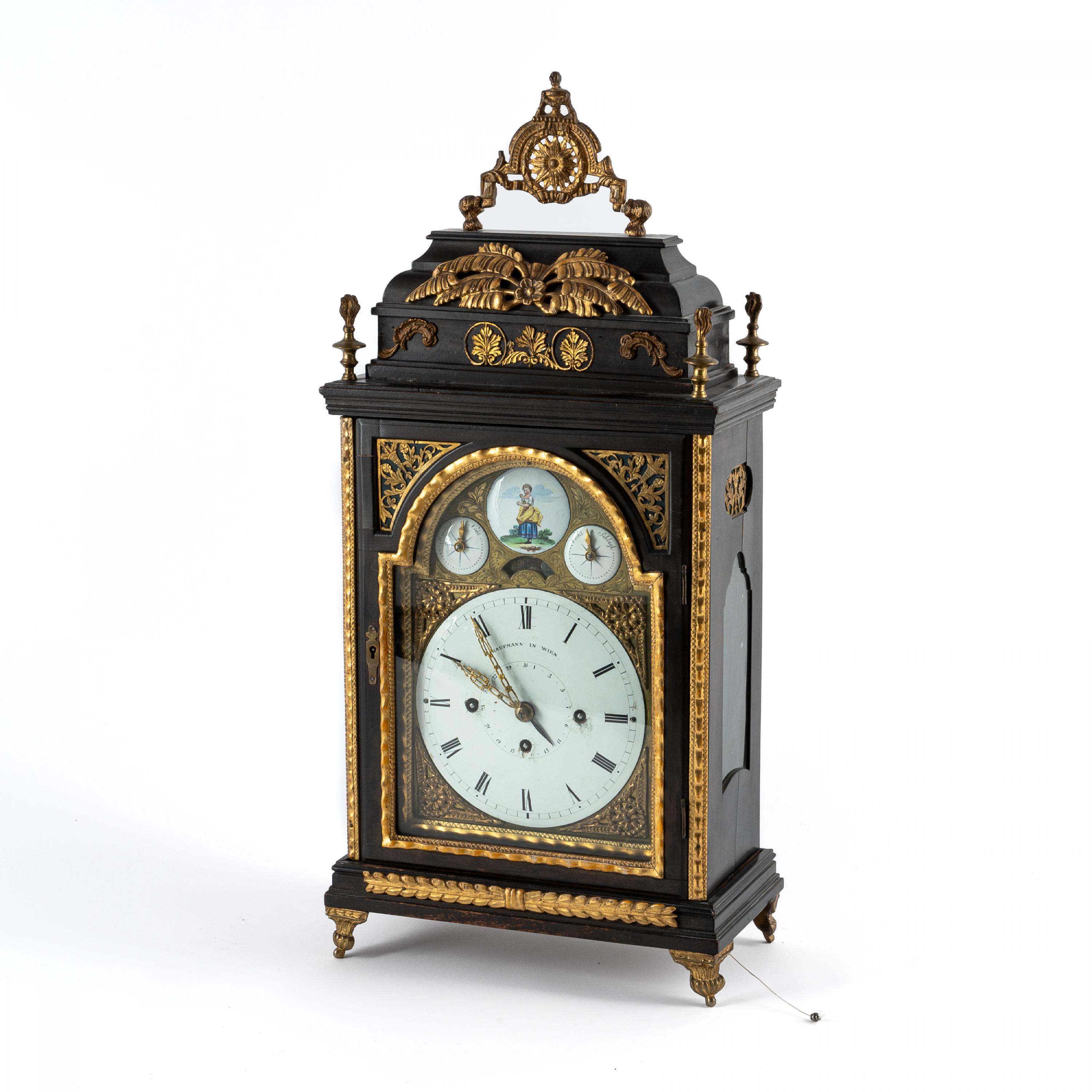 Vierseitig verglaster Kasten. Emailzifferblatt mit römischen Stunden und arabischer Minuterie. Im Bogenfeld über der XII Scheinpendel, Schlag- und Repetitionsabstellung, sowie runde Emailplakette mit jungem Mädchen einen Vogel haltend. Tagesläufer mit Viertelstundenschlag auf 2 Glocken, Birnpendel. .