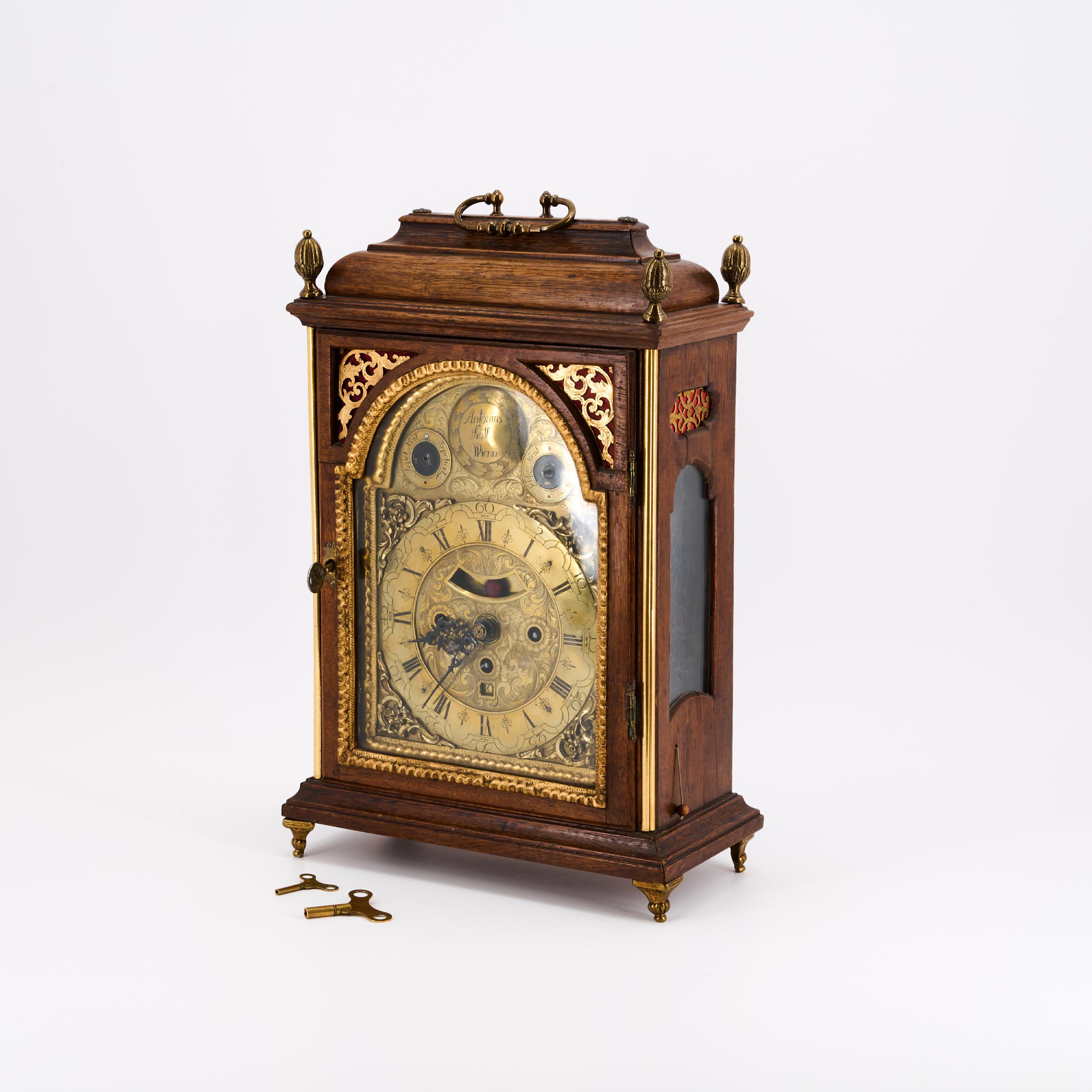 Ziffernkranz mit römischen Stunden und arabischer Minuterie, Scheinpendel mit geschliffenem Glasstein, Datumsanzeige, Schlag- und Repetitionsabstellung. Spindelgang mit Kette und Schnecke, festes Pendel, 4/4 Schlag auf zwei Glocken, Repetition, Gangdauer ca. 60 Stunden. .