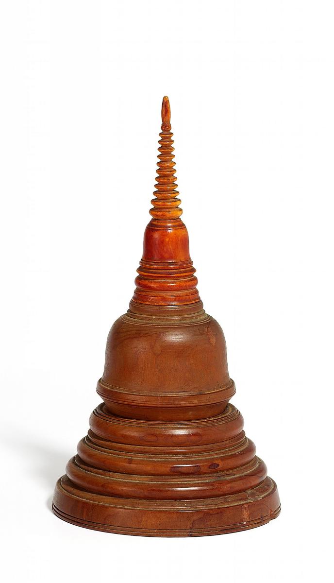 Beschreibung: Der untere Teil aus Sandelholz mit einer Aushöhlung zur Aufnahme heiliger Objekte, der