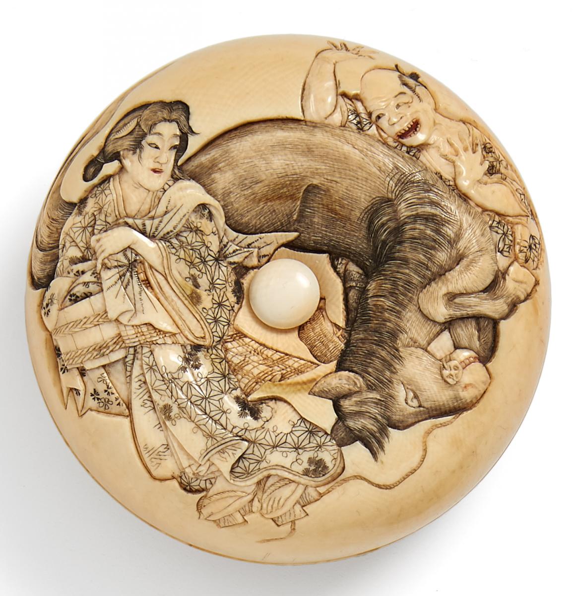 SUMO-MANJÛ, ZWEITEILIG. DAME MIT PFERD. ELFENBEIN. SIGN.: MEIJITSU.