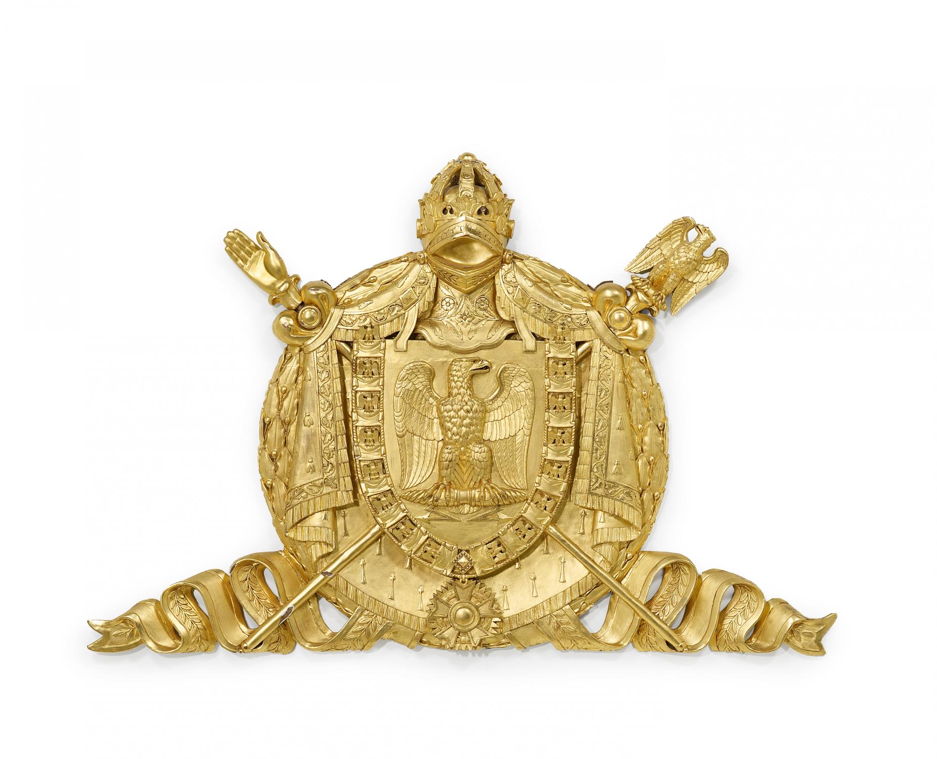 80 x 118. Reich drapiertes Wappen mit Herrschaftsinsignien Napoléon Bonapartes, sowie napoleonischem