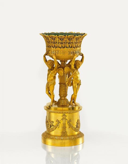 Ein recht großer Tafelaufsatz mit drei prächtigen, vollplastischen Zephyrknaben. Die Gestaltung des kunstvoll gefertigten Korbes mit Weinrankendekor ist von bemerkenswerter Qualität. Hervorzuheben ist auch die überaus hohe Qualität der Vergoldung.
