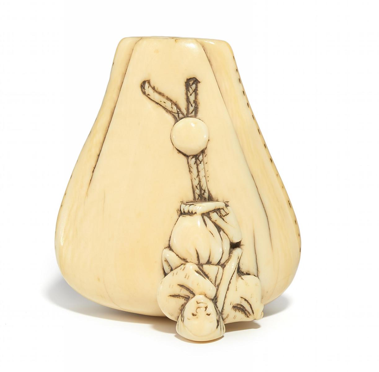 Beschreibung: Reizvolle Darstellung eines Tabaksbeutels mit Schnur, Ojime und Netsuke in Form eines