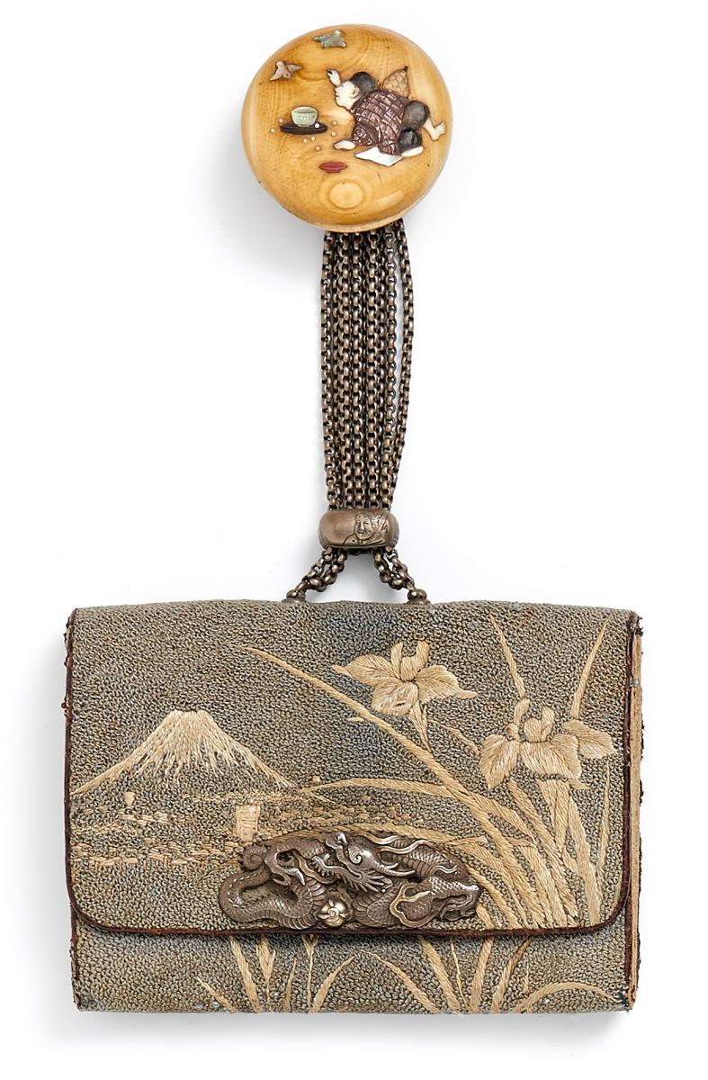 Beschreibung: Tabaktasche mit Drachenschließe, auf der Vorderseite gestickt eine Ansicht des Fuji,