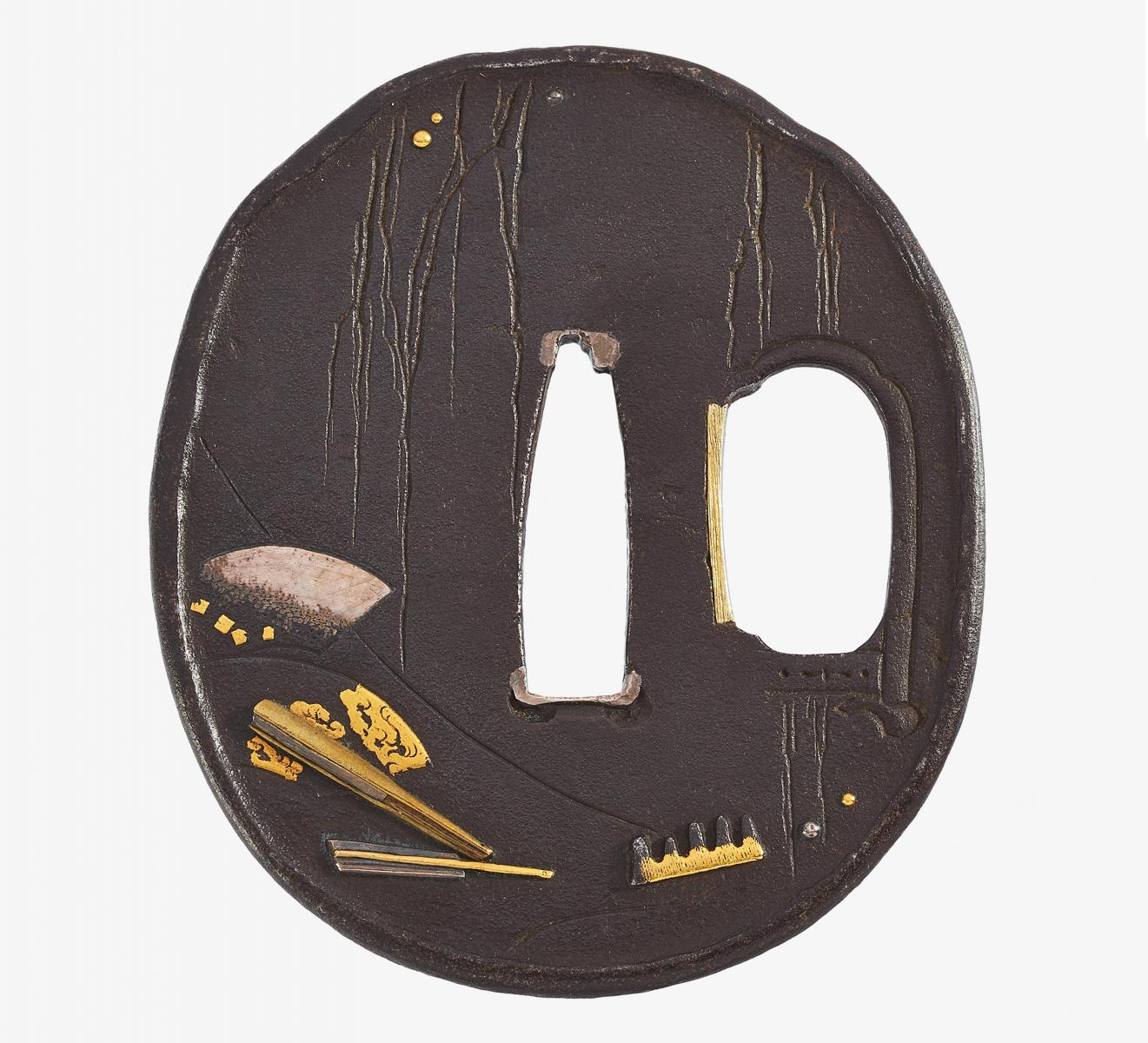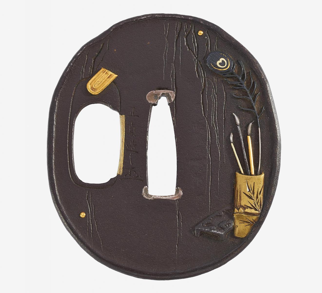Beschreibung: In kräftigem Relief mit Sentoku Pinselbecher mit Pinseln und Pfauenfeder, dazu Suzuri und