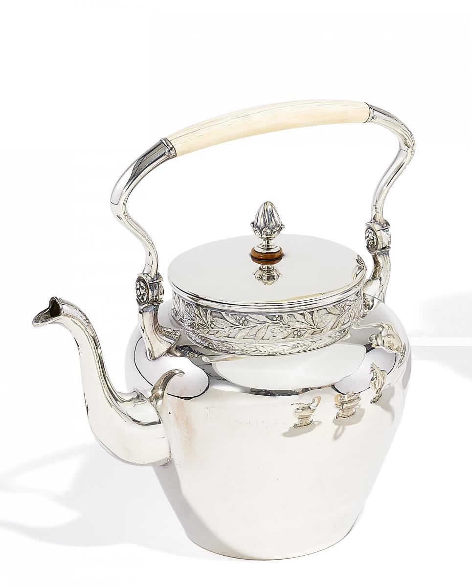 Silber. Elfenbeingriff. Ca. 928g. Höhe (bei aufgestelltem Henkel) 24cm.