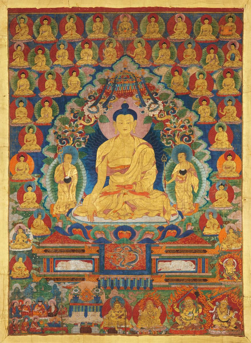 Beschreibung: Im Zentrum der historische Buddha Shakyamuni mit bhumisparsha mudra, flankiert von seinen