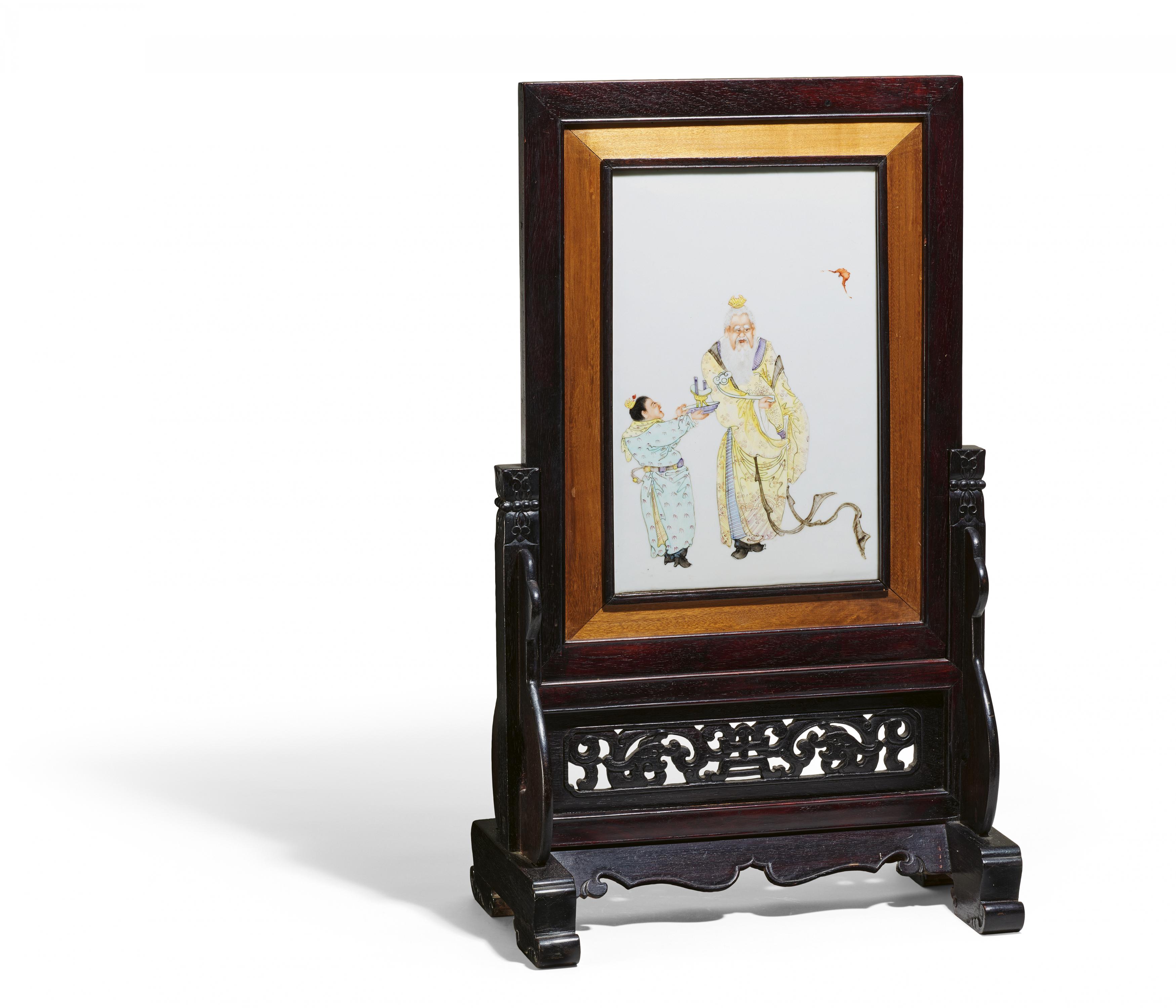 hält ein ruyi-Zepter aus Jade in der Rechten. Der vor ihm stehende Knabe, ebenfalls in