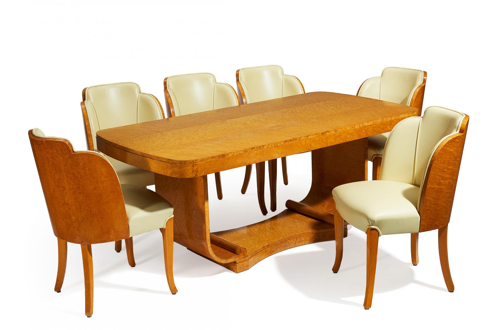 Vogelaugenahorn. Gepolstert. Rechteckige Tischplatte mit abgerundeten Ecken auf zwei breiten geschwungenen Stützen.