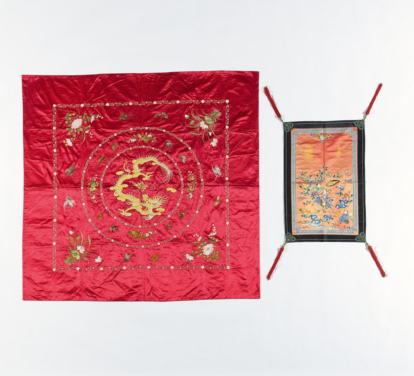 Tischtuch mit Drachen und Stuhllehenbehang mit Qilin.
