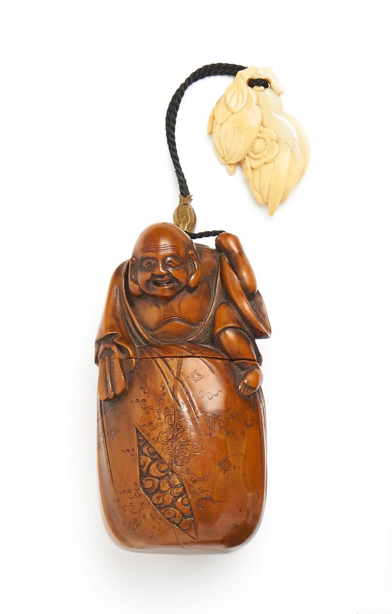 Zustand B. Beilage: Ojime: Sentoku, zusammengerolltes Lotosblatt. Netsuke: Toggle, Elfenbein, Buddhashandzitrus und Pflaumenblüte, L.5,9cm.