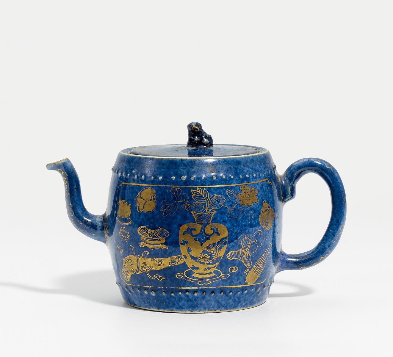 Technik: Porzellan, puderblau mit Goldmalerei.