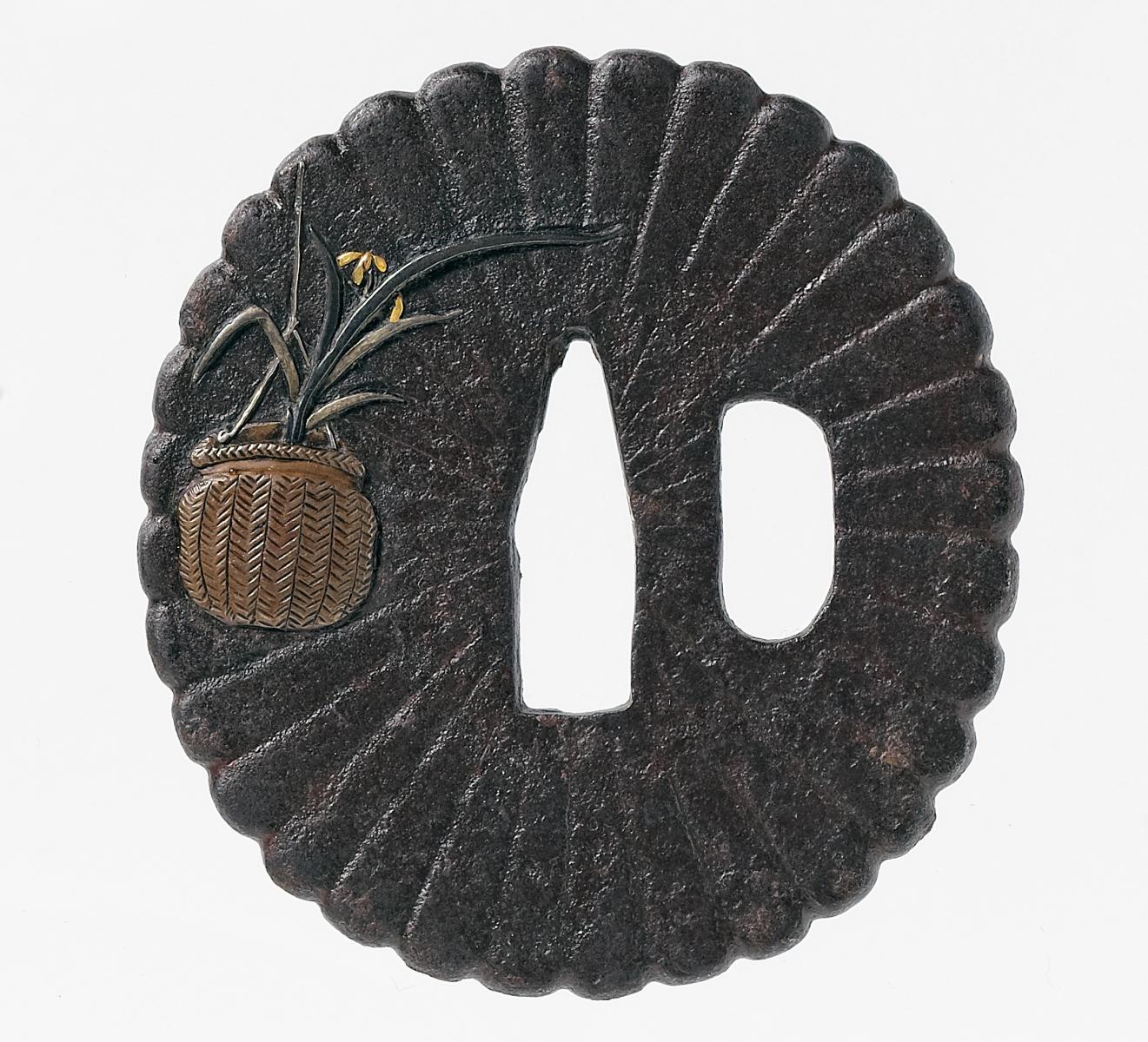 Beschreibung: In iroe-takabori ein Dreifuß, in dem ein kleines, blühendes Pflaumenbäumchen steht.