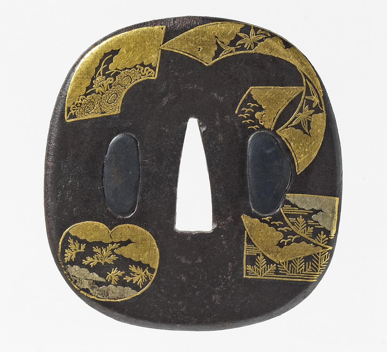 Beschreibung: Bedeckt mit fächer-, shikishi-, tanzaku- und herzförmigen Auflagen aus zweifarbigem Gold