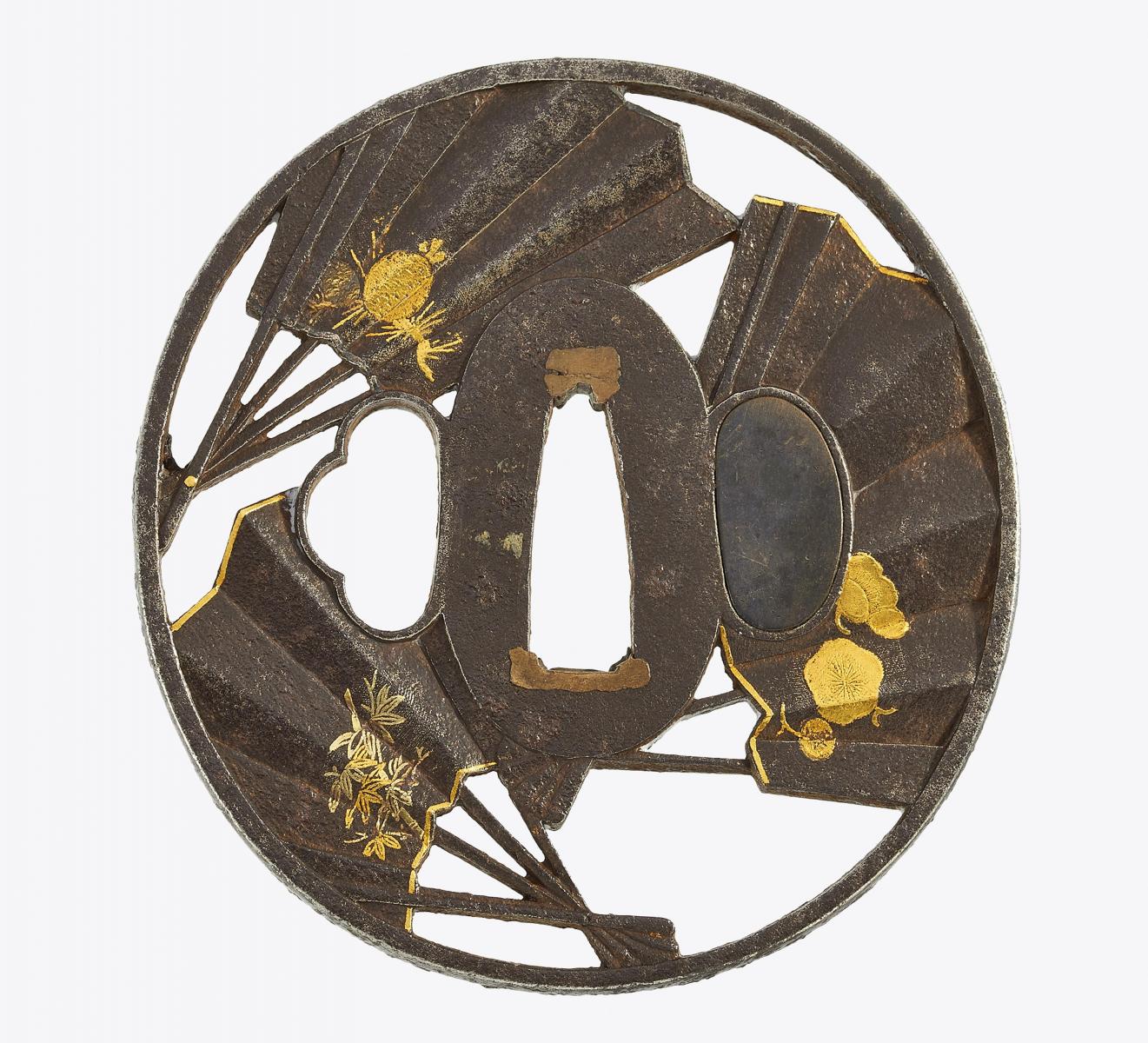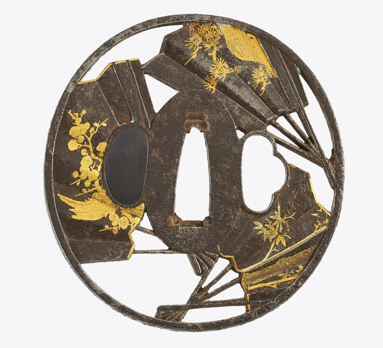 'sho-chiku-bai' (Kiefer-Bambus-Pflaumenblüte) in zweitoniger Gold-Tauschierung zeigen.
