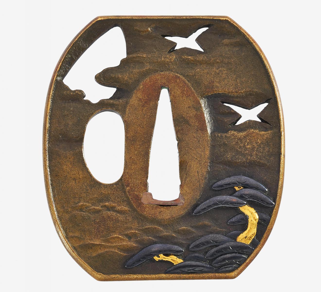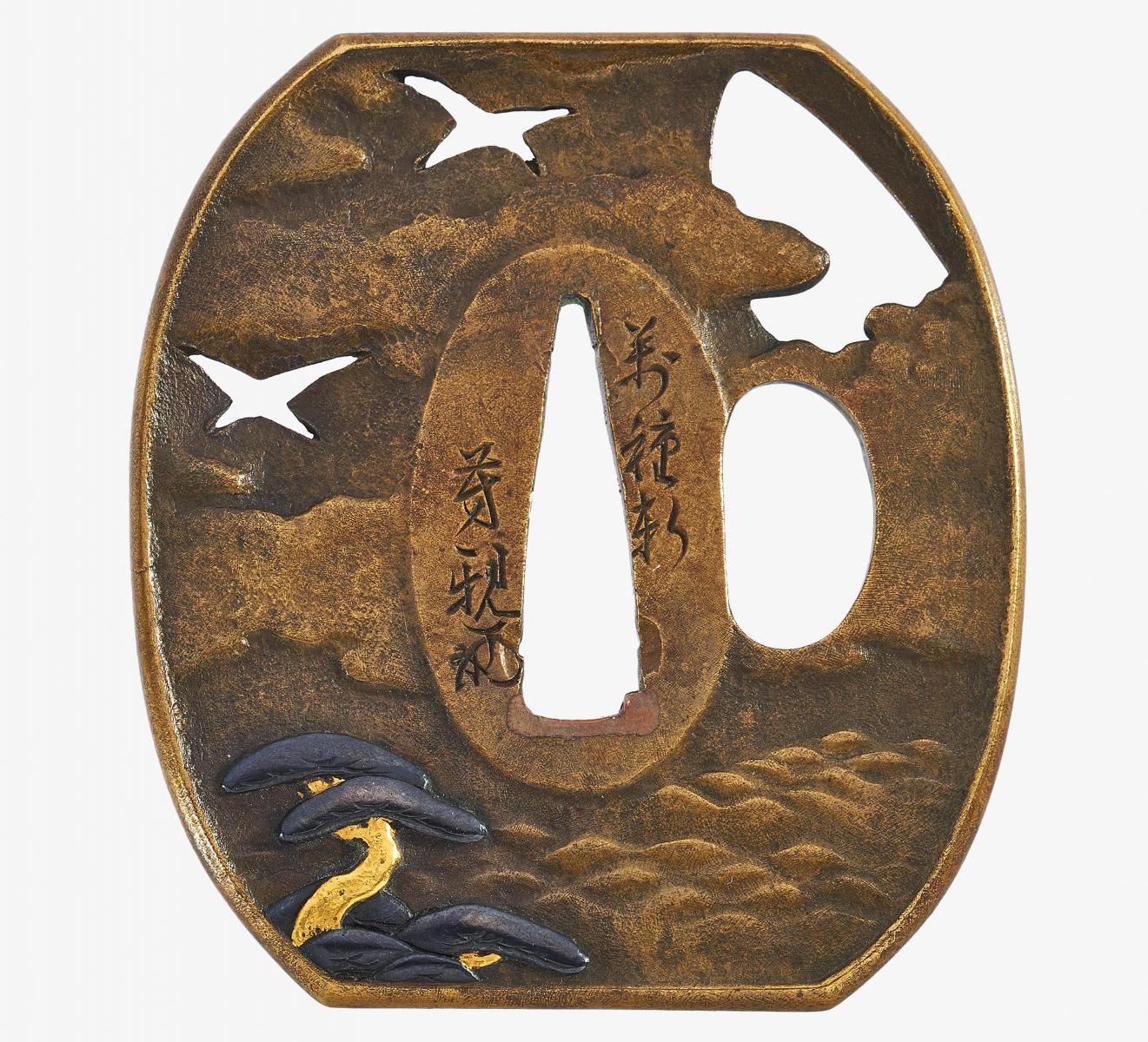 Beschreibung: In Shakudô- und Gold-Relief große Kiefern vor einer Küste, in Durchbrechung